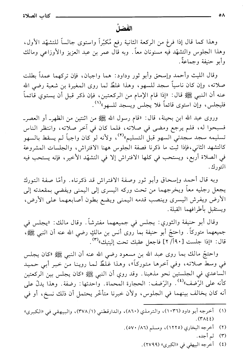 وروى عبد ابن بحينة، قال: (قام رسول الله - صلى الله عليه وسلم - من اثنتين من الظهر- أو العصر- فسبحوا له، فلم يرجع ومضى في صلاته، فلما كان في آخر صلاته، وانتظر الناس تسليمه سجد سجدتي السهو قبل التسليم)، ولأنه لو كان واجبًا لم يسقط بالسهو كالتشهد الثاني، فإذا ثبت ما ذكرنا فصفة الجلوس ههنا الافتراش، والجلسات المشروعة في الصلاةَ أربع، ويستحب في كلها الافتراش إلا في التشهد الأخير، فإنه يستحب فيه التورك.
