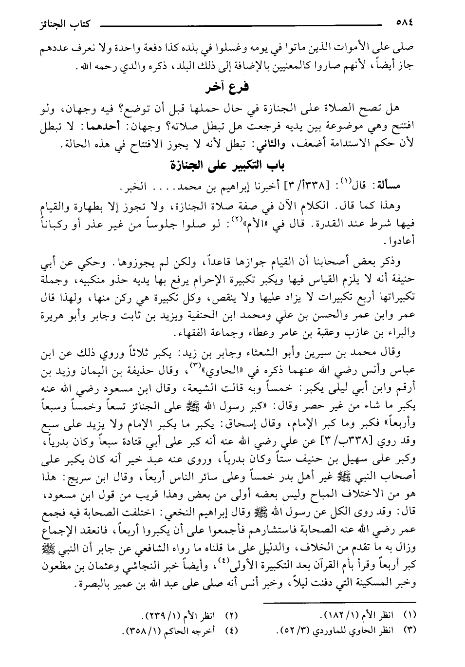 وذكر بعض أصحابنا أن القيام جوازها قاعداً، ولكن لم يجوزوها. وحكي عن أبي حنيفة أنه لا يلزم القياس فيها ويكبر تكبيرة الإحرام يرفع بها يديه حذو منكبيه، وجملة تكبيراتها أربع تكبيرات لا يزاد عليها ولا ينقص، وكل تكبيرة هي ركن منها، ولهذا قال عمر وابن عمر والحسن بن علي ومحمد ابن الحنفية ويزيد بن ثابت وجابر وأبو هريرة والبراء بن عازب وعقبة بن عامر وعطاء وجماعة الفقهاء.