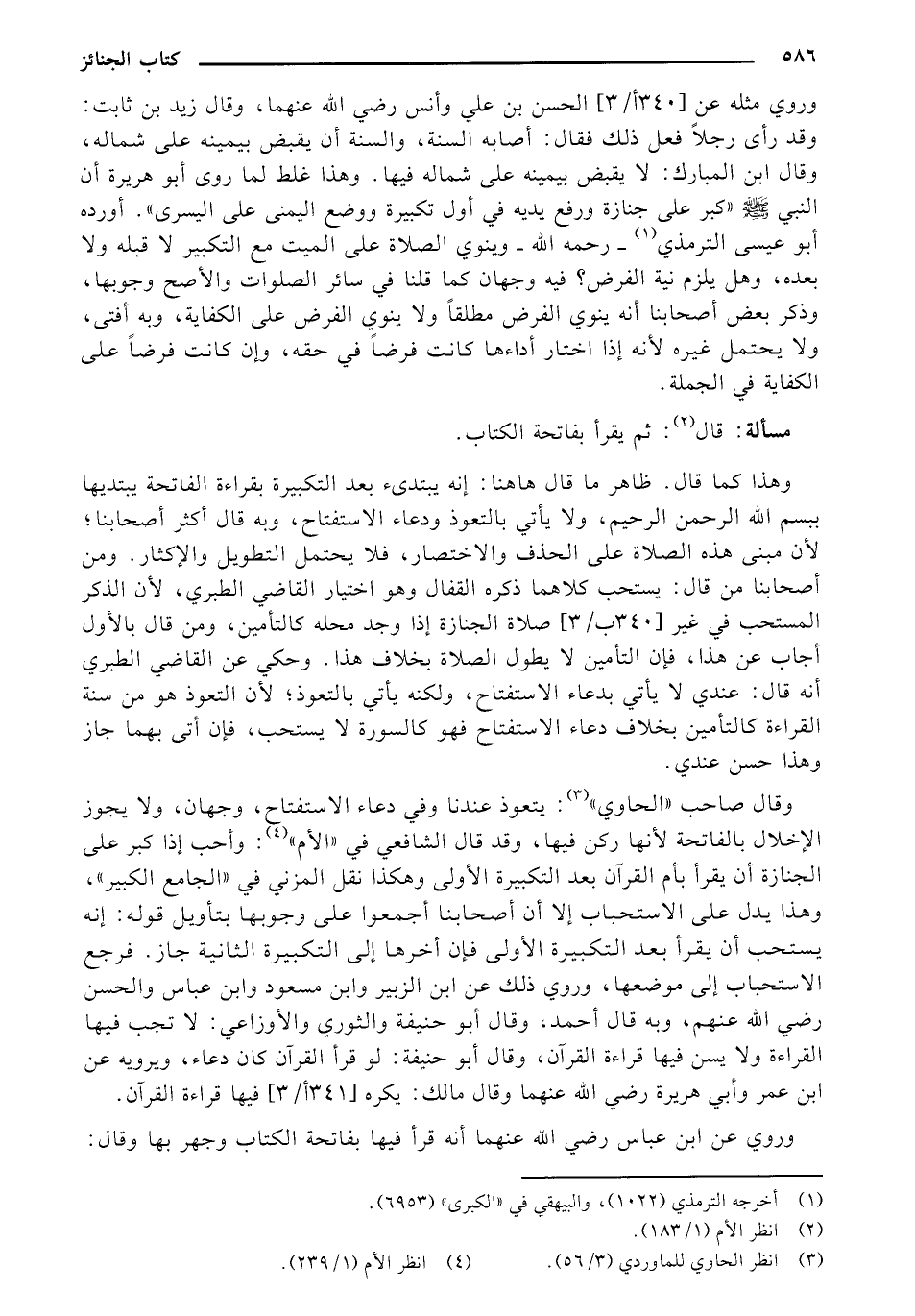 وروي مثله عن [340 أ/3] الحسن بن علي وأنس رضي الله عنهما، وقال زيد بن ثابت: وقد رأى رجلًا فعل ذلك فقال: أصابه السنة، والسنة أن يقبض بيمينه على شماله، وقال ابن المبارك: لا يقبض بيمينه على شماله فيها. وهذا غلط لما روى أبو هريرة أن النبي - صلى الله عليه وسلم - "كبر على جنازة زرفع يديه في أول تكبيرة ووضع اليمنى على اليسرى". أورده أبو عيسى الترمذي - رحمه الله - وينوي الصلاة على الميت مع التكبير لا قبله ولا بعده، وهل يلزم نية الفرض؟ فيه وجهان كما قلنا في سائر الصلوات والأصح وجوبها، وذكر بعض أصحابنا أنه ينوي الفرض مطلقاً ولا ينوي الفرض على الكفاية، وبه أفتى، ولا يحتمل غيره لأنه إذا اختار أداءها كانت فرضاً في حقه، وإن كانت فرضاً على الكفاية في الجملة.