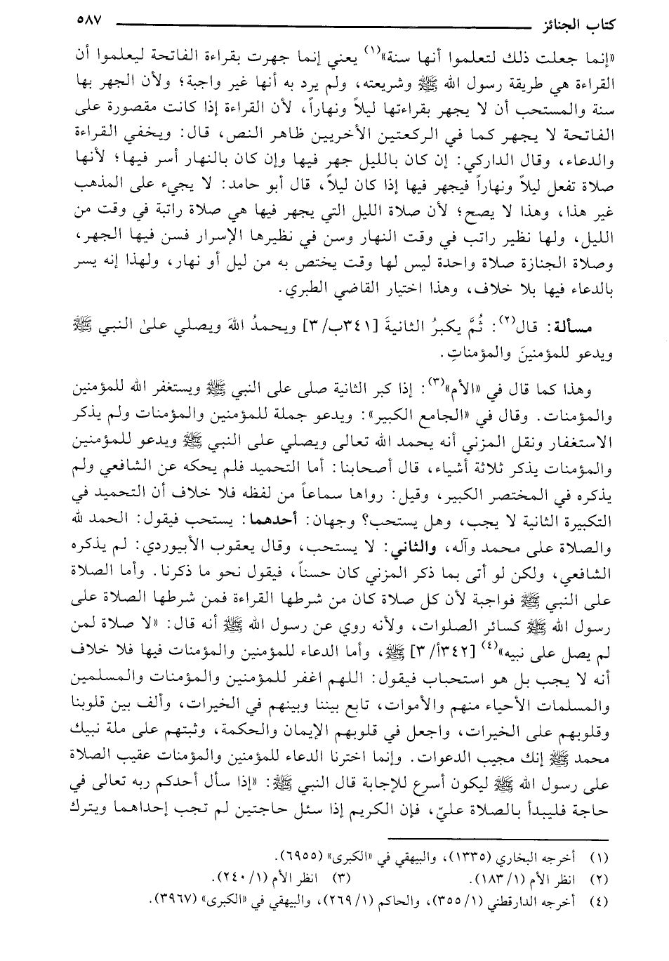 "إنما جعلت ذلك لتعلموا أنها سنة" يعني إنما جهرت بقراءة الفاتحة ليعلموا أن القراءة هي طريقة رسول الله - صلى الله عليه وسلم - وشريعته، ولم يرد به أنها غير واجبة؛ ولأن الجهر بها سنة والمستحب أن لا يجهر بقراءتها ليلًا ونهاراً، لأن القراءة إذا كانت مقصورة على الفاتحة لا يجهر كما في الركعتين الأخريين ظاهر النص، قال: ويخفي القراءة والدعاء، وقال الداركي: إن كان بالليل جهر فيها وغن كان بالنهار أسر فيها؛ لأنها صلاة تفعل ليلًا ونهاراً فيجهر فيها إذا كان ليلًا، قال أبو حامد: لا يجئ على المذهب غير هذا، وهذا لا يصح؛ لأن صلاة الليل التي يجهر فيها هي صلاة راتبة في وقت من الليل، ولها نظير راتب في وقت النهار وسن في نظيرها الإسرار فسن فيها الجهر، وصلاو الجنازة صلاة واحدة ليس لها وقت يختص به من ليل أو نهار، ولهذا إنه يسر بالدعاء فيها بلا خلاف، وهذا اختيار القاضي الطبري.