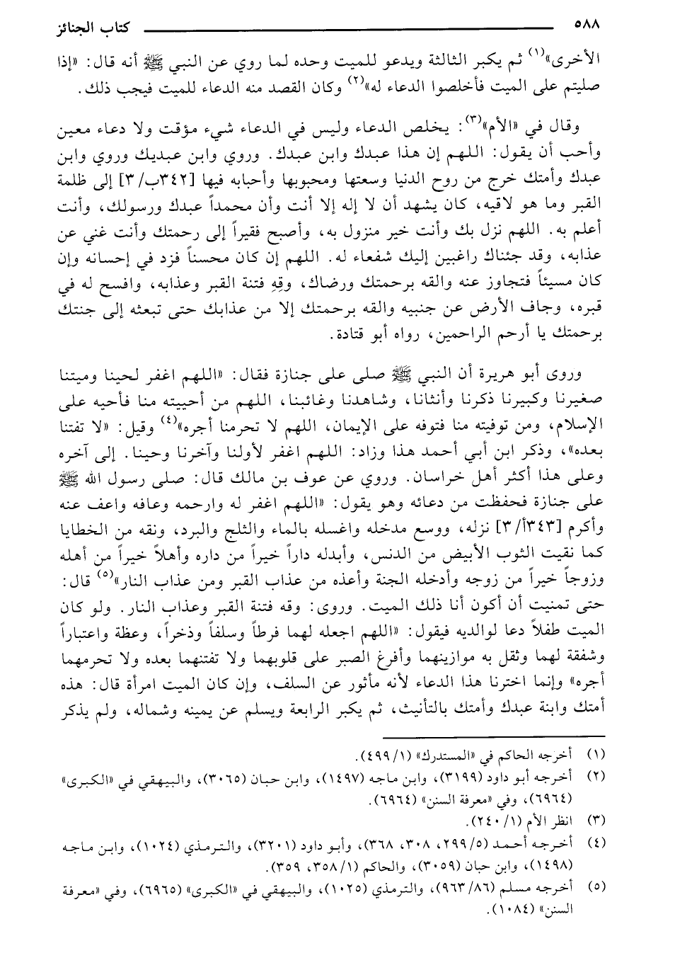 وقال في: الأم": يخلص الدعاء وليس في الدعاء ش ئ مؤقت ولا دعاء معين وأحب أن يقول: اللهم إن هذا عبدك وابن عبدك. وروي وابن عبديك وروي وابن عبدك وأمتك خرج من روح الدنيا وسعتها ومحبوبها وأحبابه فيها [342 ب/3] إلى ظلمة القبر وما هو لاقيه، كان يشهد أن لا إله إلا أنت وأن محمداً عبدك ورسولمك، وأنت أعلم به. اللهم نزل بك وأنت خير منزول به، وأصبح فقيراً إلى رحمتك وأنت غني عن عذابه، وقد جئناك راغبين إليك شفعاء له. اللهم إن كان محسناً فزد في إحسانه وإن كان مسيئاً فتجاوز عنه والقه برحمتك إلا من عذابك حتى تبعثه إلى جنتك برحمتك يا أرحم الراحمين، رواه أبو قتادة.