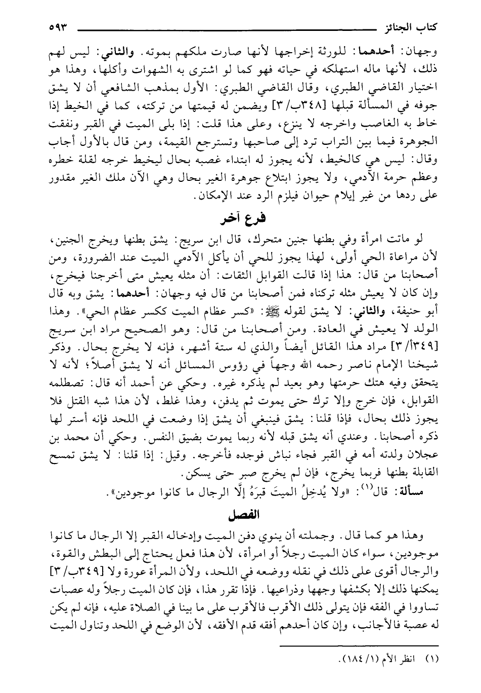 لو ماتت امرأة وفي بطنها جنين متحرك، قال ابن سريج: يشق بطنها ويخرج الجنين، لأن مراعاة الحي أولى، لهذا يجوز للحي أن يأكل الآدمي الميت عند الضرورة، ومن أصحابنا من قال: هذا إذا قالت القوابل الثقات: أن مثله يعيش متى أخرجنا فيخرج، وإن كان لا يعيش مثله تركناه فمن أصحابنا من قال فيه وجهان: أحدهما: يشق وبه قال أبو حنيفة، والثاني: لا يشق لقوله - صلى الله عليه وسلم -: "كسر عظام الميت ككسر عظام الحي". وهذت الولد لا يعيش في العادة. ومن أصحابنا من قال: وهو الصحيح مراد ابن سريج [349 أ/3] مراد هذا القائل أيضًا والذي له ستة أشهر، فإنه لا يخرج بحال. وذكر شيخنا الإمام ناصر رحمه الله وجهًا في رؤوس المسائل أنه لا يشق أصلًا؛ لأنه لا يتحقق وفيه هتك حرمتها وهو بعيد لم يذكره غيره. وحكي عن أحمد أنه قال: تصطلمه القوابل، فإن خرج وإلا ترك حتى يموت ثم يدفن، وهذا غلط، لأن هذا شبه القتل فلا يجوز ذلك بحال، فإذا قلنا: يشق فينبغي أن يشق إذا وضعت في اللحد فإنه أستر لها ذكره أصحابنا. وعندي أنه يشق قبله لأنه ربما يموت بضيق النفس. وحكي أن محمد بن عجلان ولدته أمه في القبر فجاء نباش فوجده فأخرجه. وقيل: إذا قلنا: لا يشق تمسح القابلة بطنها فربما يخرج، فإن لم يخرج صبر حتى يسكن.