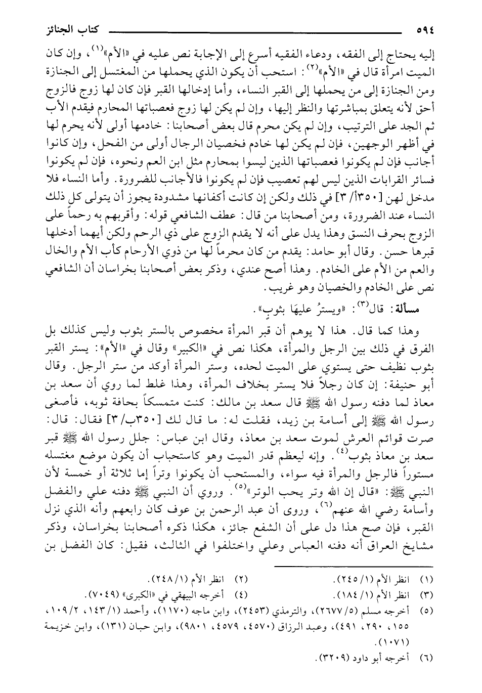 إليه يحتاج إلى الفقه، ودعاء الفقيه أسرع إلى الإجابة نص عليه في "الأم"، وإن كان الميت امرأة قال في "الأم": استحب أن يكون الذي يحملها من المغتسل إلى الجنازة ومن الجنازة إلى من يحملها إلى القبر النساء، وأما إدخلها القبر فإن كان لها زوج فالزوج أحق لأنه يتعلق بمباشرتها والنظر إليها، وإن لم يكن لها زوج فعصباتها المحارم فيقدم الأب ثم الجد على الترتيب، وإن لم يكن لها خادم فخصيان الرجال أولى من الفحل، وإن كانوا أجانب فإن لم يكونوا فعصابتها الذين ليسوا بمحارم مثل ابن العم ونحوه، فإن لم يكونوا فسائر القرابات الذين ليس لهم تعصيب فإن لم يكونوا فالأجانب للضرورة. وأما النساء فلا مدخل لهن [350 أ/ 3] في ذلك ولكن إن كانت أكفانها مشدودة يجوز أن يتولى كل ذلك النساء عتد الضرورة، ومن أصحابنا من قال: عطف الشافعي قوله: وأقربهم به رحما على الزوج بحرف النسق وهذا يدل على أنه لا يقدم الزوج على ذي الرحم ولكن أيهما أدخلها قبرها حسن. وقال أبو حامد: يقدم من كان محرما لها من ذوي الأرحام كأب الأم والخال والعم من الأم على الخادم. وهذا أصح عندي، وذكر بعض أصحابنا بخراسان أن الشافعي نص على الخادم والخصيان وهو غريب.