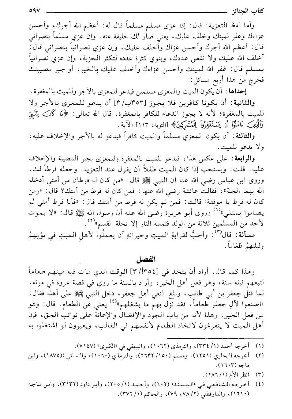 والرابعة: على عكس هذا، فيدعو للميت بالمغفرة وللمعزى بجبر المصيبة والإخلاف عليه. قلت: ويستحب إذا كان الميت طفلًا أن يقول عند التعزية: وجعله فرطاً لك. وروى ابن عباس رضي الله عنه أن النبي - صلى الله عليه وسلم - قال: "من كان له فرطان من أمتي أدخله الله بهما الجنة"، فقالت عائشة رضي الله عنها: فمن كان له فرط من أمتك؟ قال: "ومن كان له فرط يا موفقة" قالت: فمن لم يكن له فرط من أمتك قال: "فأنا فرط أمتي لم يصابوا بمثلي" وروى أبو هريرة رضي الله عنه أن رسول الله - صلى الله عليه وسلم - قال: "لايموت لأحد من المسلمين ثلاثة من الولد فتمسه النار إلا تحلة القسم".