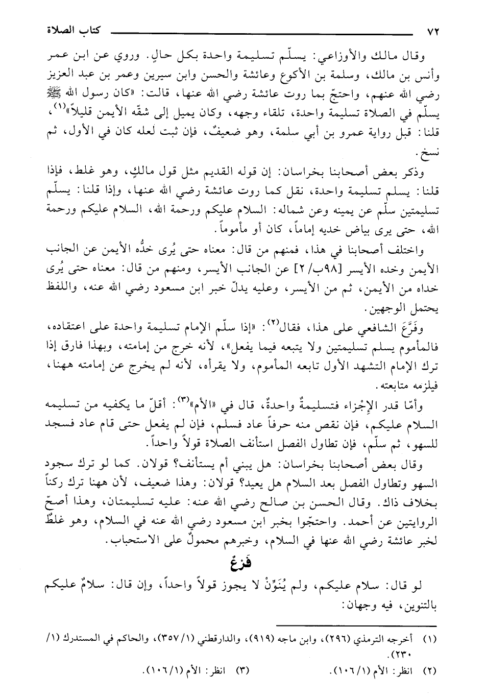 وقال مالك والأوزاعي: يسلم تسليمة واحدة بكل حال. وروي عن ابن عمر وأنس بن مالك، وسلمة بن الأكوع وعائشة والحسن وابن سيرين وعمر بن عبد العزيز رضي الله عنهم، واحتج بما روت عائشة رضي الله عنها، قالت: "كان رسول الله - صلى الله عليه وسلم - يسلم في الصلاة تسليمة واحدة، تلقاء وجهه، وكان يميل إلى شقّه الأيمن قليلًا"، قلنا: قبل رواية عمرو بن أبي سلمة، وهو ضعيف، فإن ثبت لعله كان في الأول، ثم نسخ.