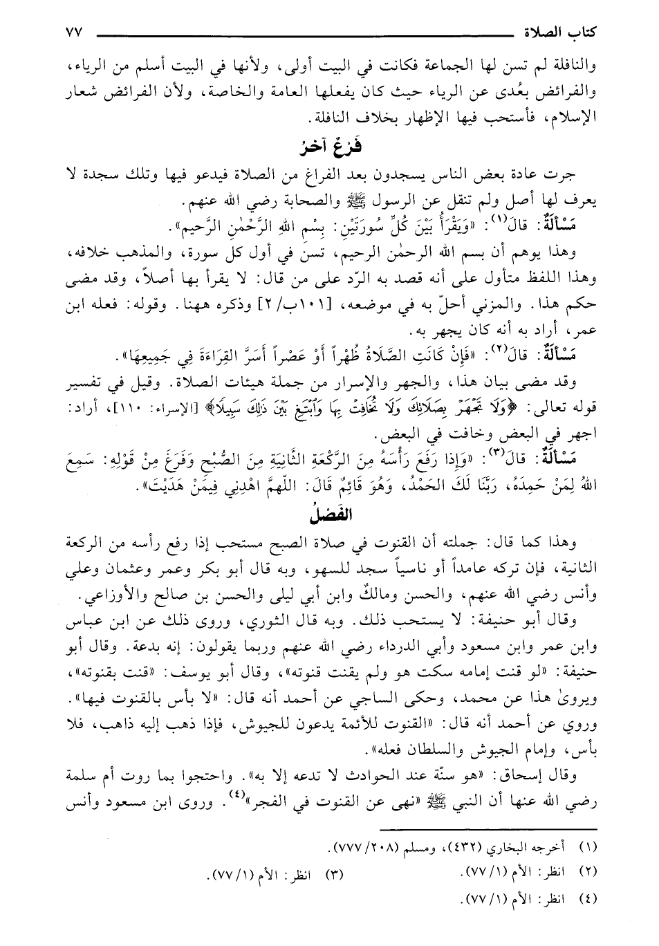وقال إسحاق: "هو سنّة عند الحوادث لا تدعه إلا به". واحتجوا بما روت أم سلمة رضي الله عنها أن النبي - صلى الله عليه وسلم - "نهى عن القنوت في الفجر". وروى ابن مسعود وأنس