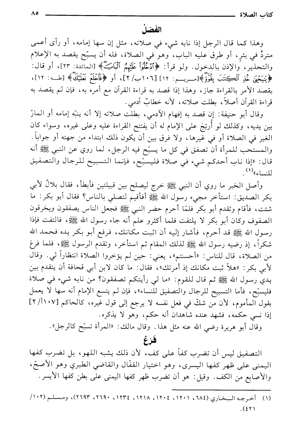 وقال أبو حنيفة: إن قصد به إفهام الآدمي، بطلت صلاته إلا أنه ينبّه إمامه أو المارّ بين يديه، وكذلك لو أرتج على الإمام له أن يفتتح القراءة عليه وعلى غيره، وسواء كان الغير في الصلاة أو في غيرها، ولا فرق بين أن يكون ذلك ابتداء من جهته أو جوابًا. والمستحب للمرأة أن تصفق في كل ما يسبّح فيه الرجل، لما روي عن النبي - صلى الله عليه وسلم - أنه قال: "إذا ناب أحدكم شيء في صلاة فليسبح، فإنما التسبيح للرجال والتصفيق للنساء".
