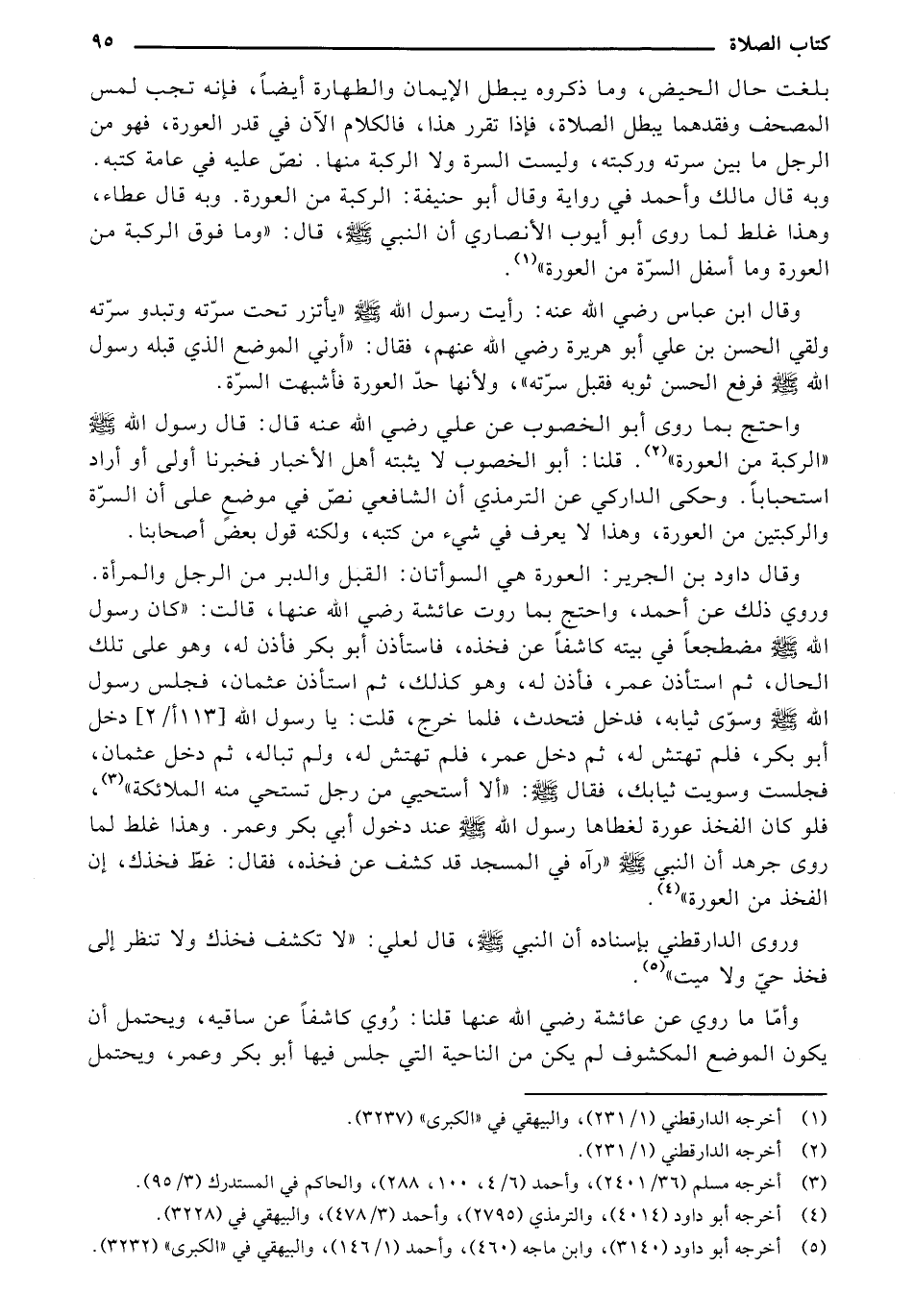 بلغت حال الحيض، وما ذكروه يبطل الإيمان والطهارة أيضًا، فإنه تجب لمس المصحف وفقدهما يبطل الصلاة، فإذا تقرر هذا، فالكلام الآن في قدر العورة، فهو من الرجل ما بين سرته وركبته، وليست السرة ولا الركبة منها. نص عليه في عامة كتبه. وبه قال مالك وأحمد في رواية وقال أبو حنيفة: الركبة من العورة. وبه قال عطاء، وهذا غلط لما روى أبو أيوب الأنصاري أن النبي - صلى الله عليه وسلم -، قال: "وما فوق الركبة من العورة وما أسفل السرّة من العورة".