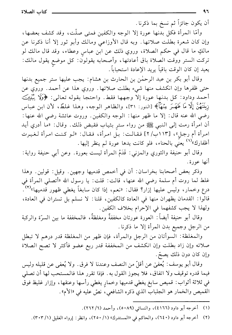 وقال أبو بكر بن عبد الرحمن بن الحارث بن هشام: يجب عليها ستر جميع بدنها حتى ظفرها وإن انكشف منها شيء بطلت صلاتها. وروي هذا عن أحمد. وروي عن أحمد وداود: كل بدنها عورة إلا وجهها فقط. واحتجا بقوله تعالى: {وَلا يُبْدِينَ زِينَتَهُنَّ إِلاَّ مَا ظَهَرَ مِنْهَا} [النور: 31]، والظاهر الوجه، وهذا غلط، لأن ابن عباس رضي الله عنه قال: إلا ما ظهر منها: الوجه والكفين. وروت عائشة رضي الله عنها: أن امرأة رمت إلى النبي - صلى الله عليه وسلم - من وراء ستر بثياب فقبض ذلك. وقال: "ما أدري أيد امرأة أم رجل"، [113 ب/ 2] فقالت: بل امرأة، فقال: "لو كنت امرأة لغيرت أظفارك" يعني بالحناء، فلو كانت يدها عورة لم ينظر إليها.