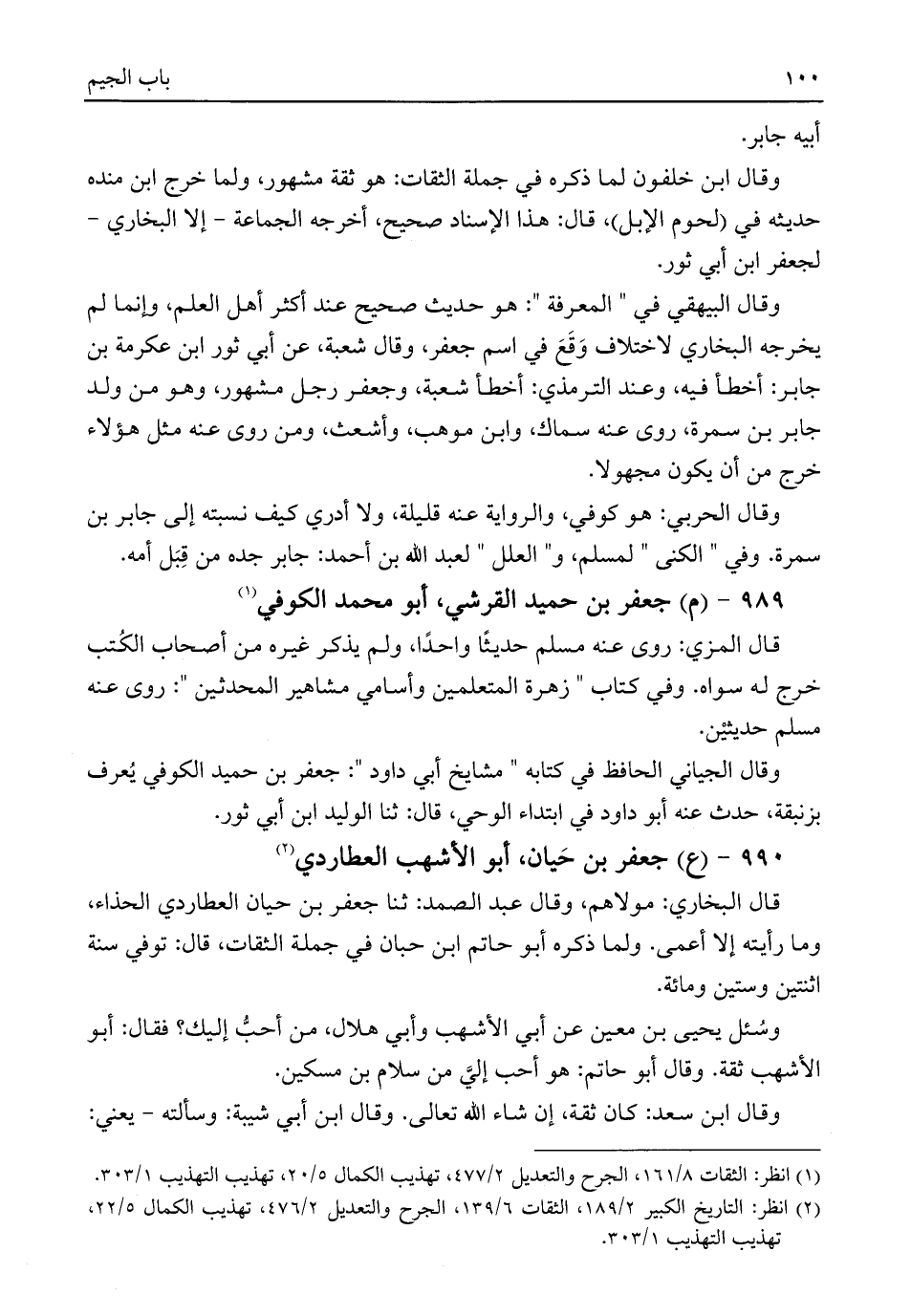 وقال ابن خلفون لما ذكره في جملة الثقات: هو ثقة مشهور، ولما خرج ابن منده حديثه في (لحوم الإبل)، قال: هذا الإسناد صحيح، أخرجه الجماعة -إلا البخاري- لجعفر ابن أبي ثور.