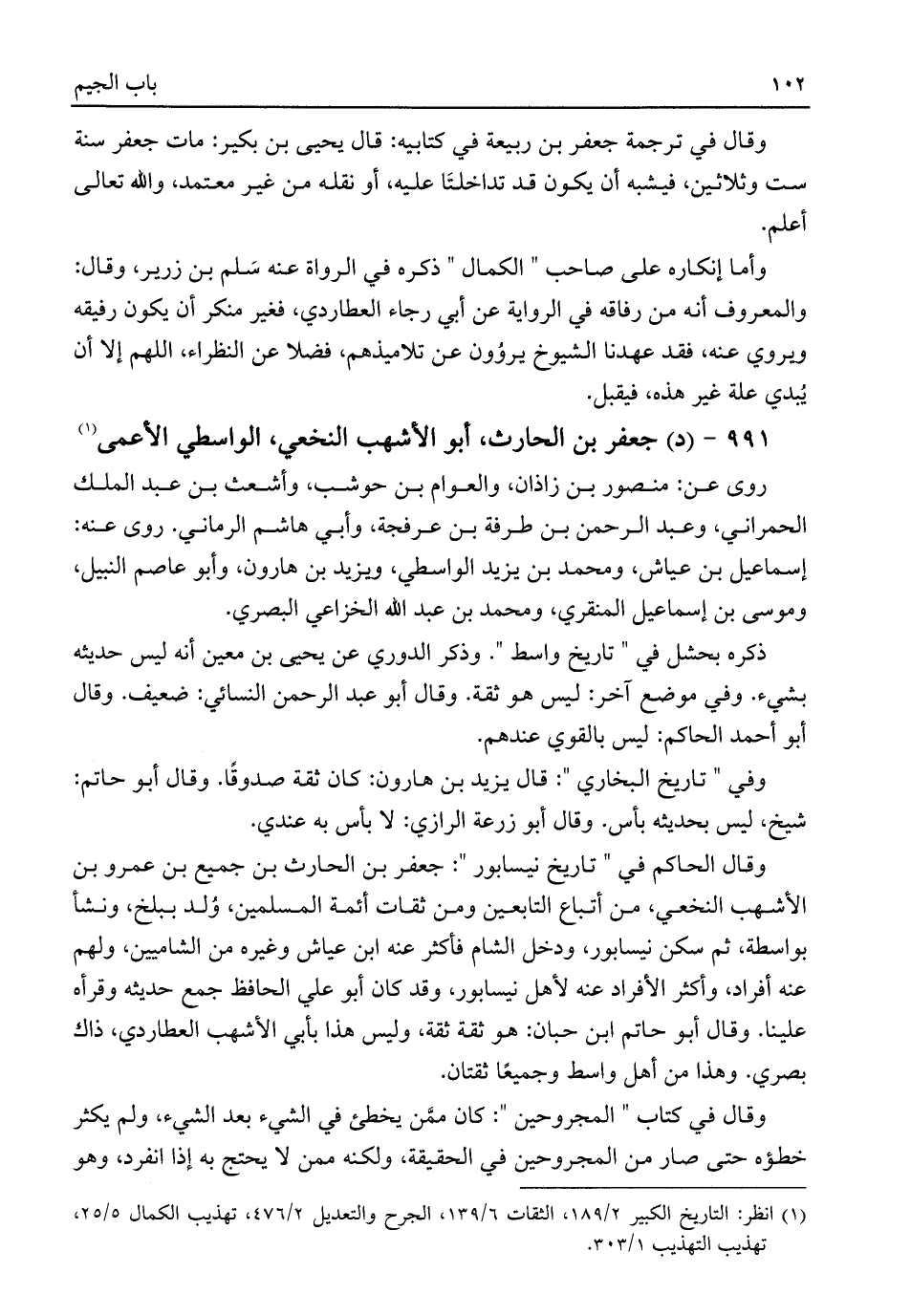وأما إنكاره على صاحب "الكمال" ذكره في الرواة عنه سَلم بن زرير، وقال: والمعروف أنه من رفاقه في الرواية عن أبي رجاء العطاردي، فغير منكر أن يكون رفيقه ويروي عنه، فقد عهدنا الشيوخ يروُون عن تلاميذهم، فضلا عن النظراء، اللهم إلا أن يُبدي علة غير هذه، فيقبل.