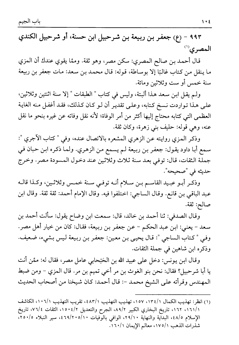 ٩٩٣ - (ع) جعفر بن ربيعة بن شرحبيل ابن حسنة، أو شرحبيل الكندي المصري (¬١)