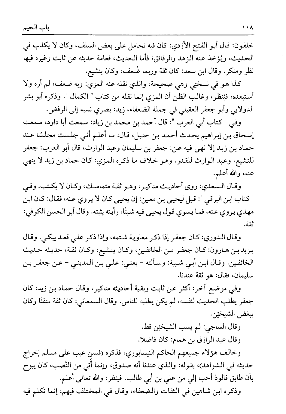 وفي موضع آخر: أكثر عن ثابت وبقية أحاديثه مناكير، وقال حماد بن زيد: كان جعفر يطلب الحديث لنفسه، لم يكن يطلبه للناس. وقال السمعاني: كان ثقة متقنًا وكان يبغض الشيخيْن.