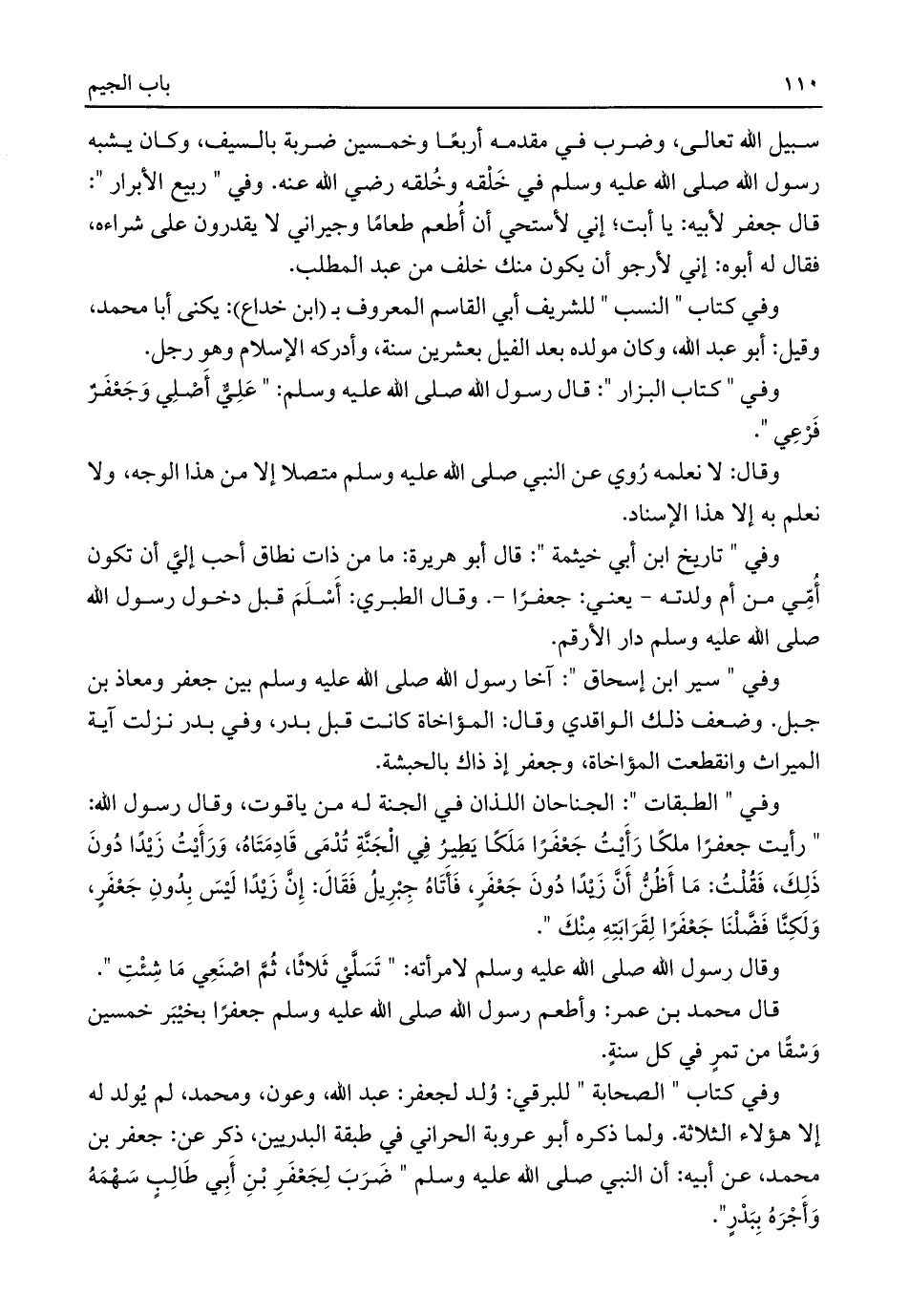 سبيل اللَّه تعالى، وضرب في مقدمه أربعًا وخمسين ضربة بالسيف، وكان يشبه رسول اللَّه صلى اللَّه عليه وسلم في خَلْقه وخُلقه رضي اللَّه عنه. وفي "ربيع الأبرار": قال جعفر لأبيه: يا أبت؛ إني لأستحي أن أُطعم طعامًا وجيراني لا يقدرون على شراءه، فقال له أبوه: إني لأرجو أن يكون منك خلف من عبد المطلب.