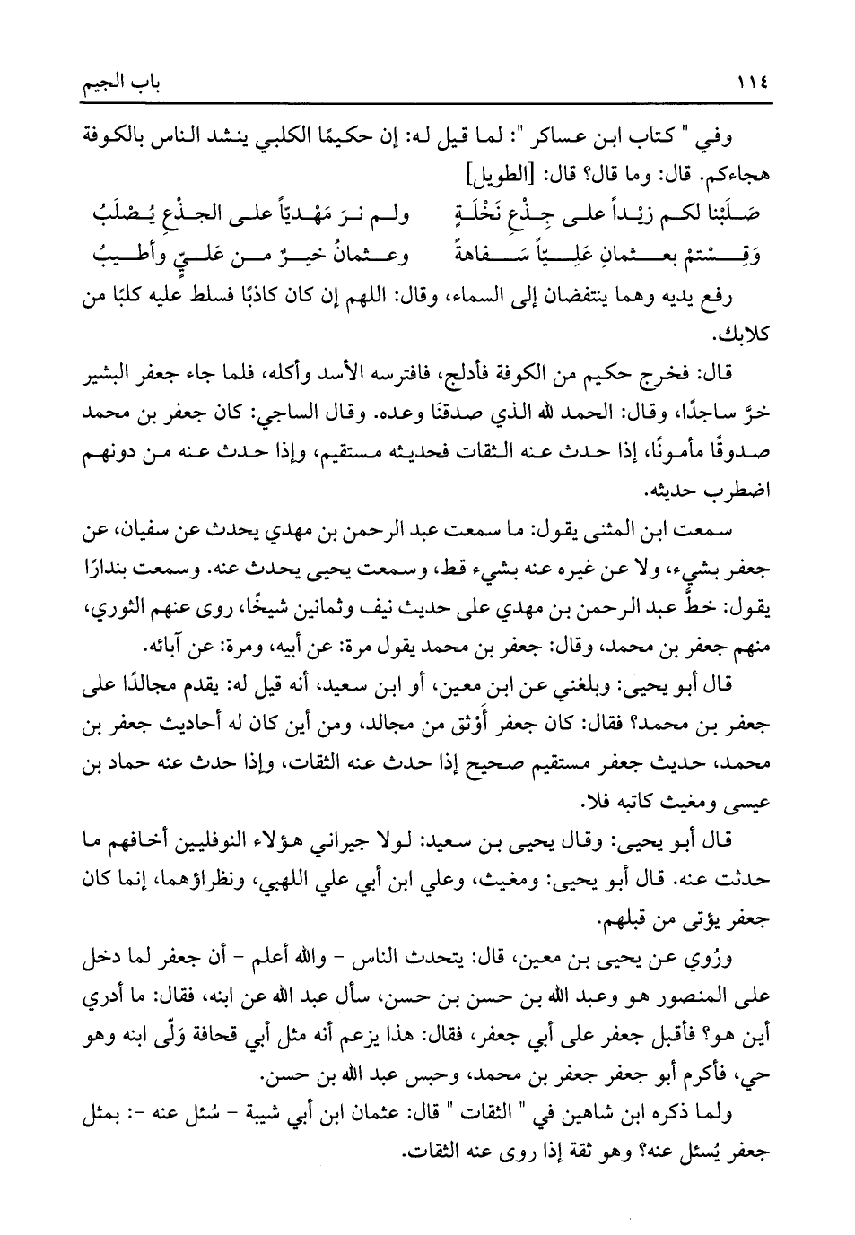قال: فخرج حكيم من الكوفة فأدلج، فافترسه الأسد وأكله، فلما جاء جعفر البشير خرَّ ساجدًا، وقال: الحمد للَّه الذي صدقنَا وعده. وقال الساجي: كان جعفر بن محمد صدوقًا مأمونًا، إذا حدث عنه الثقات فحديثه مستقيم، وإذا حدث عنه من دونهم اضطرب حديثه.