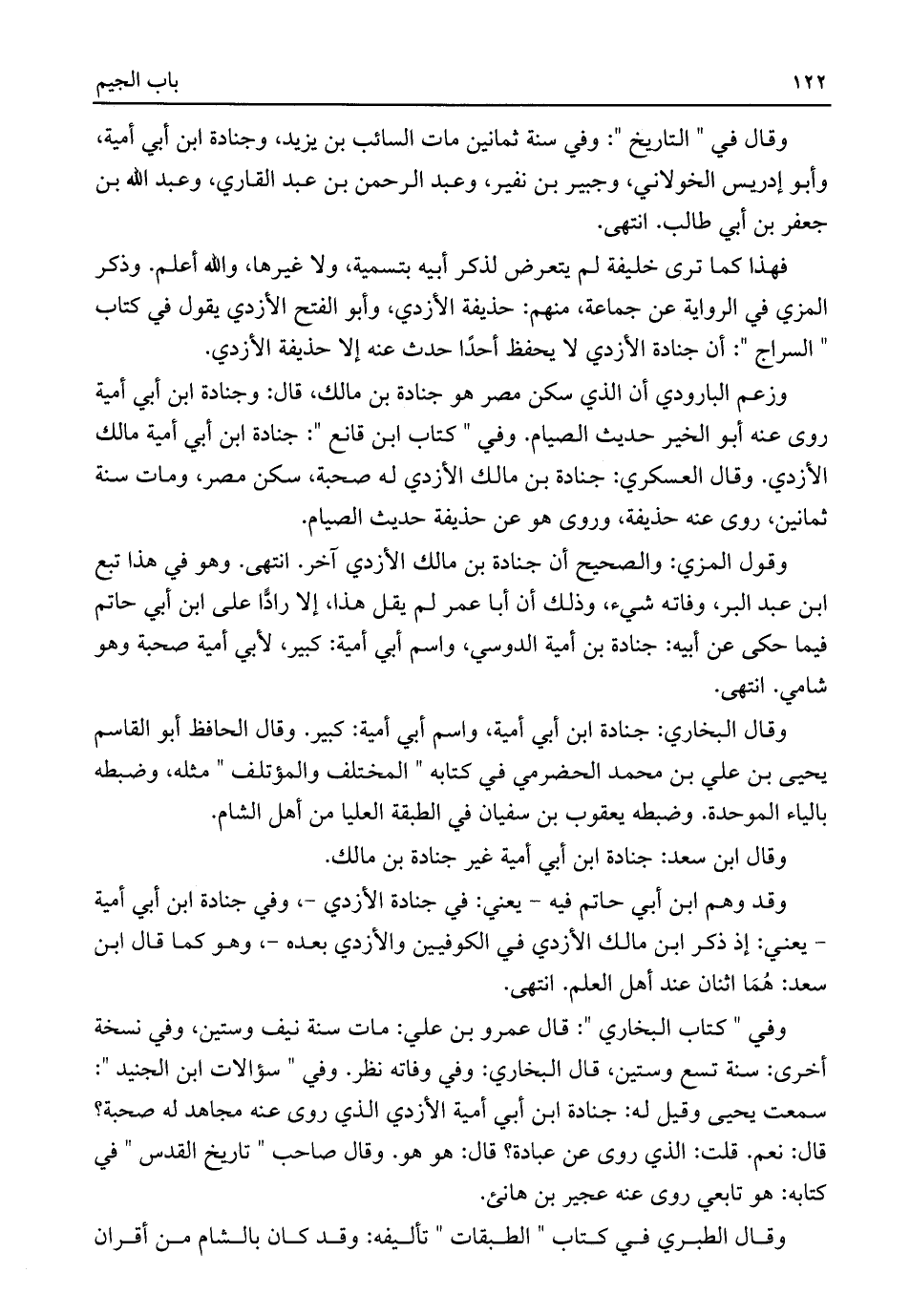 وقول المزي: والصحيح أن جنادة بن مالك الأزدي آخر. انتهى. وهو في هذا تبع ابن عبد البر، وفاته شيء، وذلك أن أبا عمر لم يقل هذا، إلا رادًّا على ابن أبي حاتم فيما حكى عن أبيه: جنادة بن أمية الدوسي، واسم أبي أمية: كبير، لأبي أمية صحبة وهو شامي. انتهى.