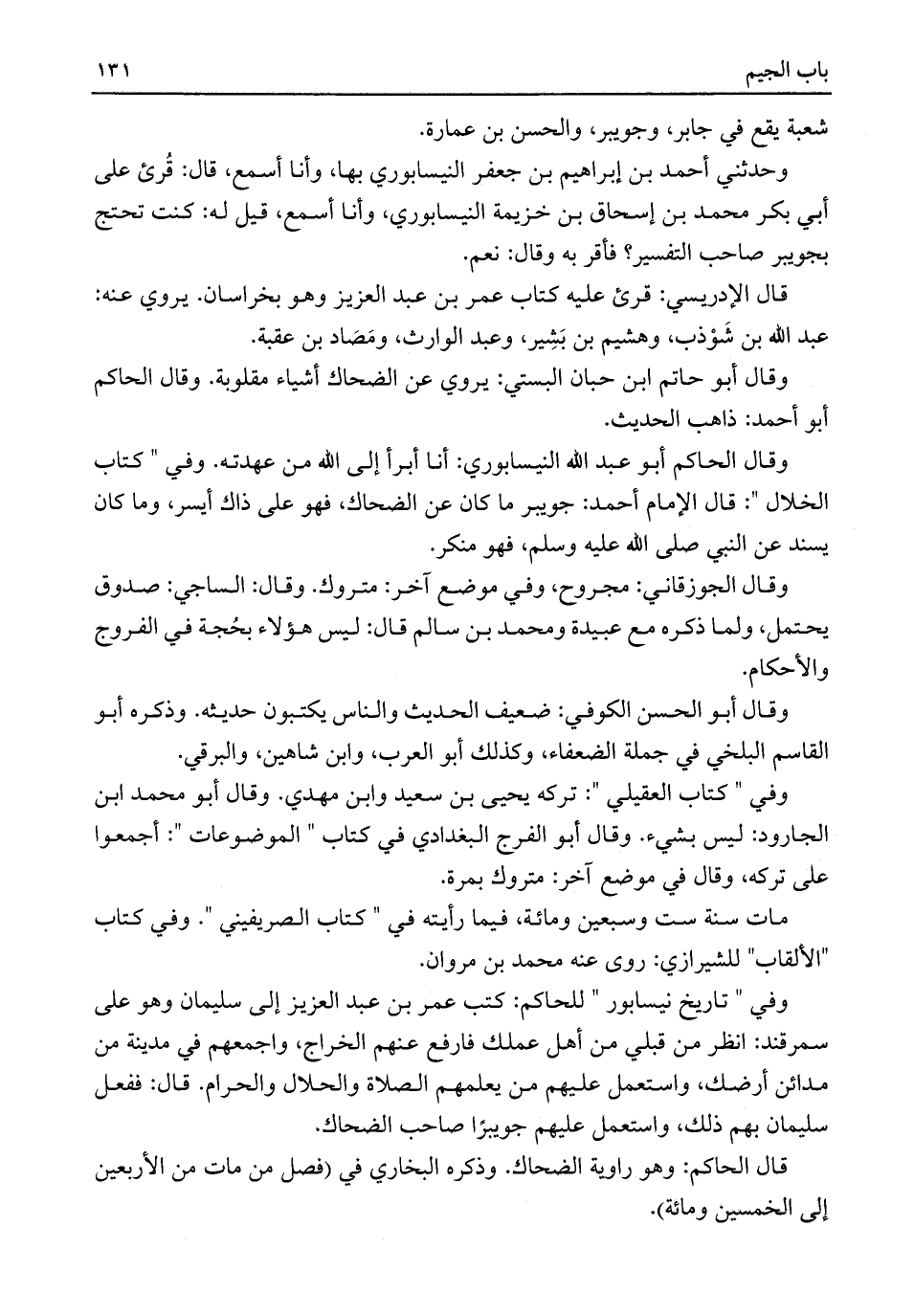 وقال الحاكم أبو عبد اللَّه النيسابوري: أنا أبرأ إلى اللَّه من عهدته. وفي "كتاب الخلال": قال الإمام أحمد: جويبر ما كان عن الضحاك، فهو على ذاك أيسر، وما كان يسند عن النبي صلى اللَّه عليه وسلم، فهو منكر.