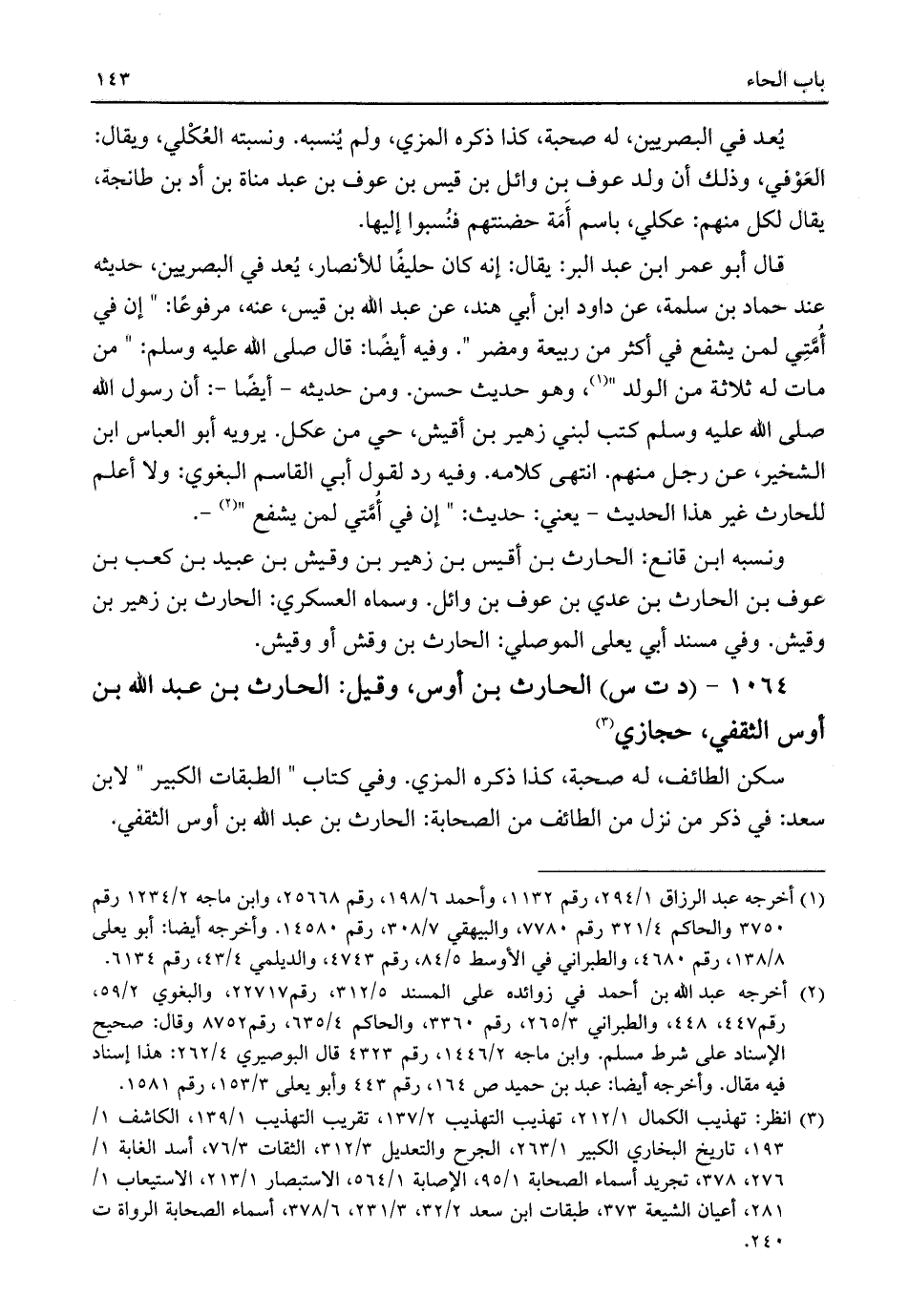 قال أبو عمر ابن عبد البر: يقال: إنه كان حليفًا للأنصار، يُعد في البصريين، حديثه عند حماد بن سلمة، عن داود ابن أبي هند، عن عبد اللَّه بن قيس، عنه، مرفوعًا: "إن في أُمَّتِي لمن يشفع في أكثر من ربيعة ومضر". وفيه أيضًا: قال صلى اللَّه عليه وسلم: "من مات له ثلاثة من الولد" (¬١)، وهو حديث حسن. ومن حديثه -أيضًا-: أن رسول اللَّه صلى اللَّه عليه وسلم كتب لبني زهير بن أقيش، حي من عكل. يرويه أبو العباس ابن الشخير، عن رجل منهم. انتهى كلامه. وفيه رد لقول أبي القاسم البغوي: ولا أعلم للحارث غير هذا الحديث -يعني: حديث: "إن في أمَّتي لمن يشفع" (¬٢) -.
