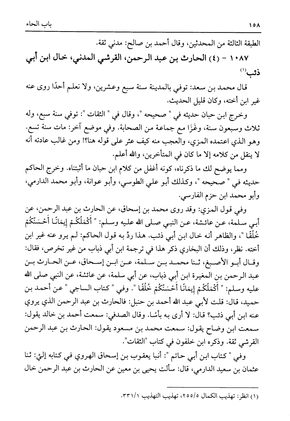 وفي قول المزي: وقد روى محمد بن إسحاق، عن الحارث بن عبد الرحمن، عن أبي سلمة، عن عائشة، عن النبي صلى اللَّه عليه وسلم: "أَكْمَلُكُمْ إِيمَانًا أَحْسَنُكُمْ خُلُقًا"، والظاهر أنه خال ابن أبي ذئب. هذا ردَّ به قول الحاكم: لم يرو عنه غير ابن أخته. نظر، وذلك أن البخاري ذكر هذا في ترجمة ابن أبي ذباب من غير تخرص، فقال: وقال أبو الأصبغ، ثنا محمد بن سلمة، عن ابن إسحاق، عن الحارث بن عبد الرحمن بن المغيرة ابن أبي ذباب، عن أبي سلمة، عن عائشة، عن النبي صلى اللَّه عليه وسلم: "أَكْمَلُكُمْ إِيمَانًا أَحْسَنُكُمْ خُلُقًا". وفي "كتاب الساجي" عن أحمد بن حميد، قال: قلت لأبي عبد اللَّه أحمد بن حنبل: فالحارث بن عبد الرحمن الذي يروي عنه ابن أبي ذئب؟ قال: لا أرى به بأسًا. وقال الصدفي: سمعت أحمد بن خالد يقول: سمعت ابن وضاح يقول: سمعت محمد بن مسعود يقول: الحارث بن عبد الرحمن القرشي ثقة. وذكره ابن خلفون في كتاب "الثقات".