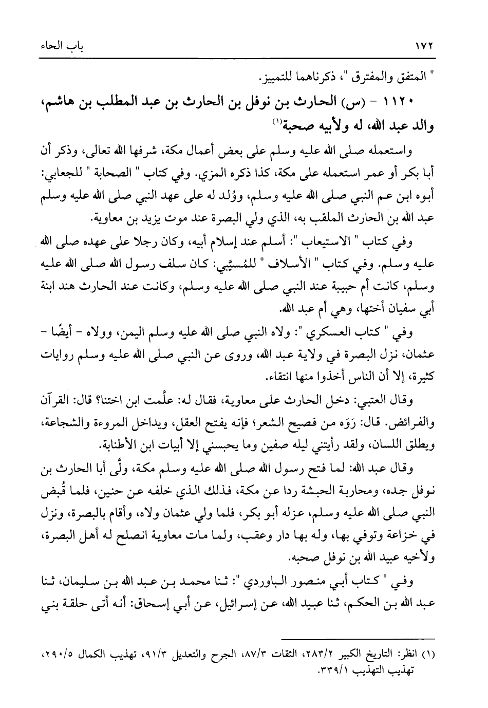 ١١٢٠ - (س) الحارث بن نوفل بن الحارث بن عبد المطلب بن هاشم، والد عبد اللَّه، له ولأبيه صحبة (¬١)