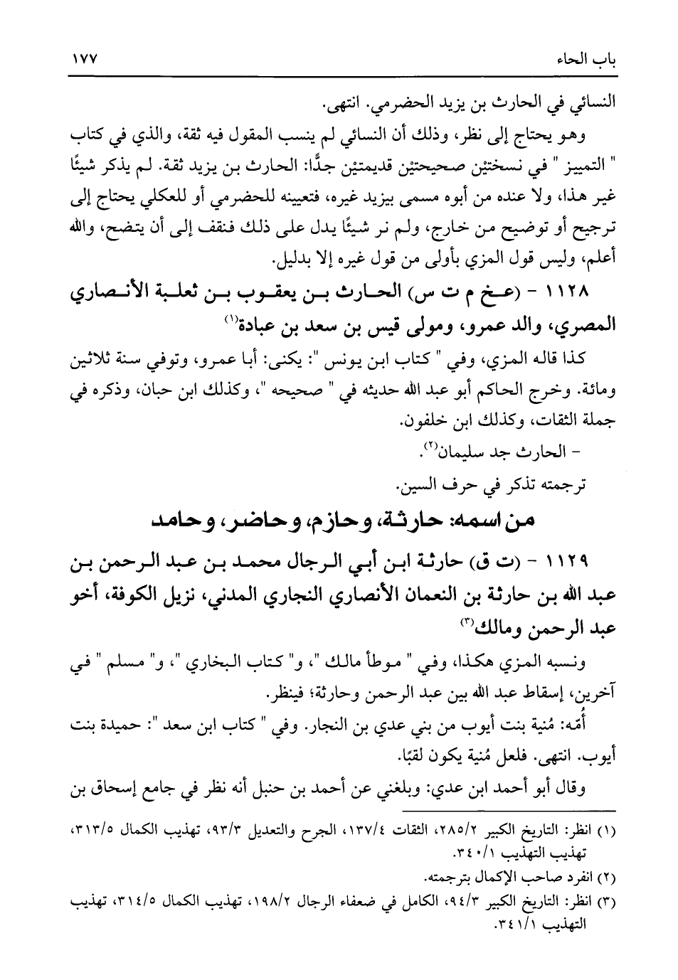 وهو يحتاج إلى نظر، وذلك أن النسائي لم ينسب المقول فيه ثقة، والذي في كتاب "التمييز" في نسختيْن صحيحتيْن قديمتين جدًّا: الحارث بن يزيد ثقة. لم يذكر شيئًا غير هذا، ولا عنده من أبوه مسمى بيزيد غيره، فتعيينه للحضرمي أو للعكلي يحتاج إلى ترجيح أو توضيح من خارج، ولم نر شيئًا يدل على ذلك فنقف إلى أن يتضح، واللَّه أعلم، وليس قول المزي بأولى من قول غيره إلا بدليل.