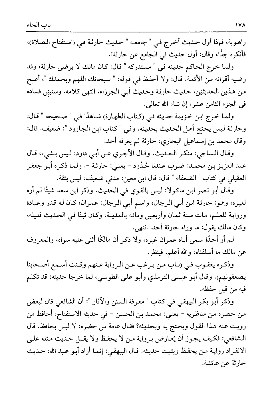 وذكر أبو بكر البيهقي في كتاب "معرفة السنن والآثار": أن الشافعي قال لبعض من حضره من مناظريه -يعني: محمد بن الحسن- في حديثه الاستفتاح: أحافظ من رويت عنه هذا القول ويحتج به وبحديثه؟ فقال عامة من حضره: لا ليس بحافظ. قال الشافعي: فكيف يجوز أن يُعارض برواية من لا يحفظ ولا يقبل حديث مثله على الانفراد رواية من يحفظ ويثبت حديثه. قال البيهقي: إنما أراد أبو عبد اللَّه: حديث حارثة عن عائشة.