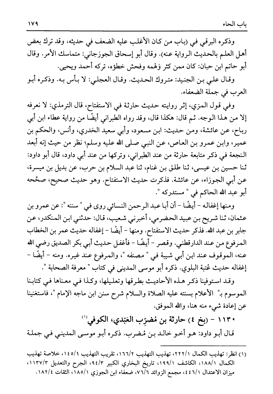 وفي قول المزي، إثر روايته حديث حارثة في الاستفتاح، قال الترمذي: لا نعرفه إلا من هذا الوجه. ثم قال: هكذا قال، وقد رواه الطبراني أيضًا من رواية عطاء ابن أبي رباح، عن عائشة، ومن حديث: ابن مسعود، وأبي سعيد الخدري، وأنس، والحكم بن عمير، وابن عمرو بن العاص، عن النبي صلى اللَّه عليه وسلم؛ نظر من حيث إنه أبعد النجعة في ذكر متابعة حارثة من عند الطبراني، وتركها من عند أبي داود، قال أبو داود: ثنا حسين بن عيسى، ثنا طلق بن غنام، ثنا عبد السلام بن حرب، عن بديل بن ميسرة، عن أبي الجوزاء، عن عائشة. فذكرت حديث الاستفتاح. وهو حديث صحيح، صحَّحه أبو عبد اللَّه الحاكم في "مستدركه".