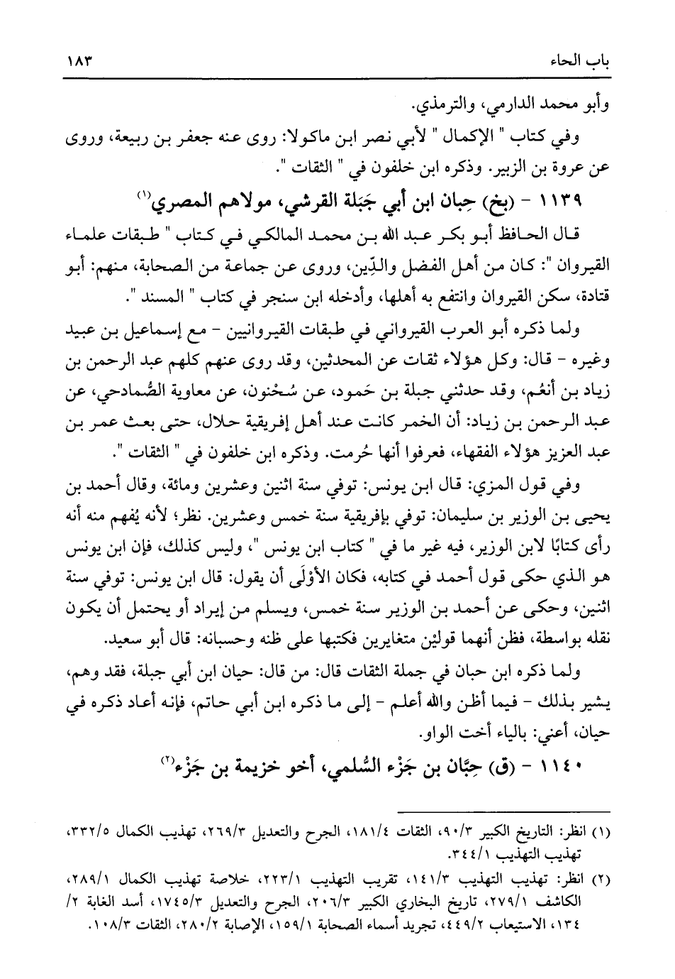 ولما ذكره ابن حبان في جملة الثقات قال: من قال: حيان ابن أبي جبلة، فقد وهم، يشير بذلك -فيما أظن واللَّه أعلم- إلى ما ذكره ابن أبي حاتم، فإنه أعاد ذكره في حيان، أعني: بالياء أخت الواو.
