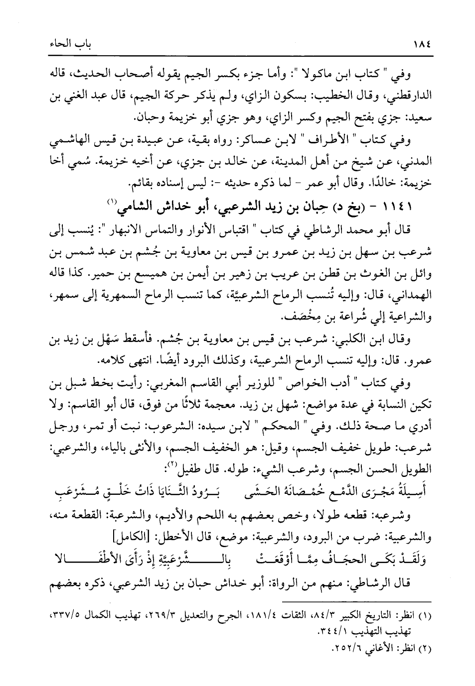 وفي كتاب "أدب الخواص" للوزير أبي القاسم المغربي: رأيت بخط شبل بن تكين النسابة في عدة مواضع: شهل بن زيد. معجمة ثلاثًا من فوق، قال أبو القاسم: ولا أدري ما صحة ذلك. وفي "المحكم" لابن سيده: الشرعوب: نبت أو تمر، ورجل شرعب: طويل خفيف الجسم، وقيل: هو الخفيف الجسم، والأنثى بالياء، والشرعبي: الطويل الحسن الجسم، وشرعب الشيء: طوله. قال طفيل (¬٢):