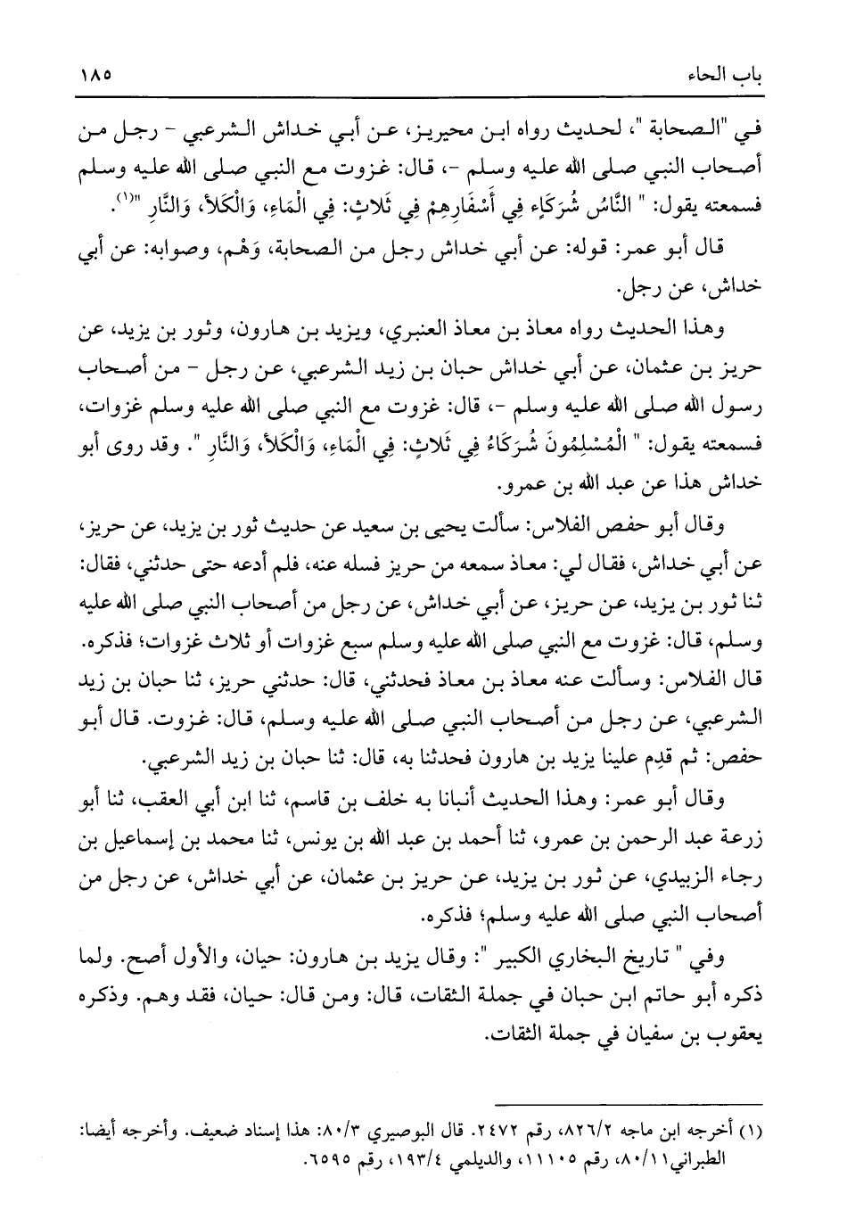 وهذا الحديث رواه معاذ بن معاذ العنبري، ويزيد بن هارون، وثور بن يزيد، عن حريز بن عثمان، عن أبي خداش حبان بن زيد الشرعبي، عن رجل -من أصحاب رسول اللَّه صلى اللَّه عليه وسلم-، قال: غزوت مع النبي صلى اللَّه عليه وسلم غزوات، فسمعته يقول: "الْمُسْلِمُونَ شُرَكَاءُ فِي ثَلاثٍ: فِي الْمَاءِ، وَالْكَلأ، وَالنَّارِ". وقد روى أبو خداش هذا عن عبد اللَّه بن عمرو.