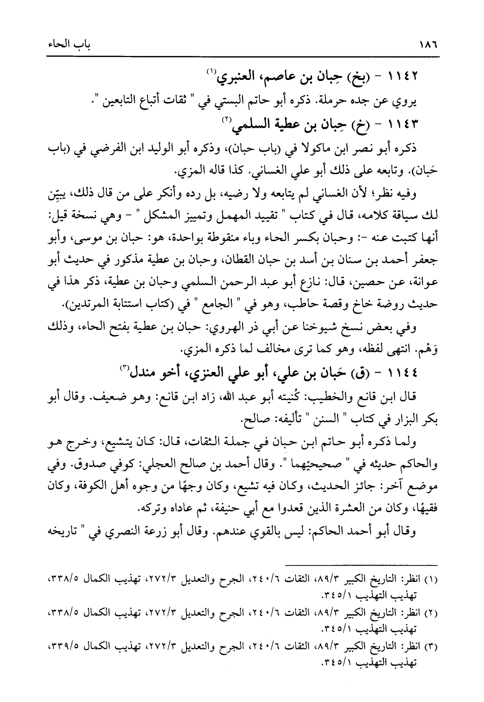 وفيه نظر؛ لأن الغساني لم يتابعه ولا رضيه، بل رده وأنكر على من قال ذلك، يبيِّن لك سياقة كلامه، قال في كتاب "تقييد المهمل وتمييز المشكل" -وهي نسخة قيل: أنها كتبت عنه-: وحبان بكسر الحاء وباء منقوطة بواحدة، هو: حبان بن موسى، وأبو جعفر أحمد بن سنان بن أسد بن حبان القطان، وحبان بن عطية مذكور في حديث أبو عوانة، عن حصين، قال: نازع أبو عبد الرحمن السلمي وحبان بن عطية، ذكر هذا في حديث روضة خاخ وقصة حاطب، وهو في "الجامع" في (كتاب استتابة المرتدين).