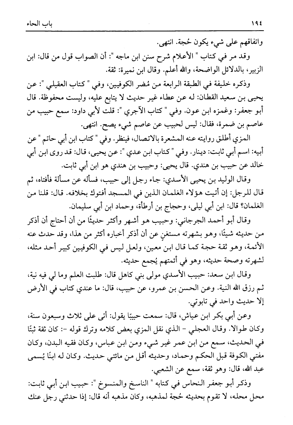 وعن أبي بكر ابن عياش، قال: سمعت حبيبًا يقول: أتى على ثلاث وسبعون سنة، وكان طوالا. وقال العجلي -الذي نقل المزي بعض كلامه وترك قوله-: كان ثقة ثبتًا في الحديث، سمع من ابن عمر غير شيء ومن ابن عباس، وكان فقيه البدن، وكان مفتي الكوفة قبل الحكم وحماد، وحديثه أقل من مائتي حديث. وكان له ابنًا يُسمى عبد اللَّه، قال: وهو ثقة، سمع عن الشعبي.