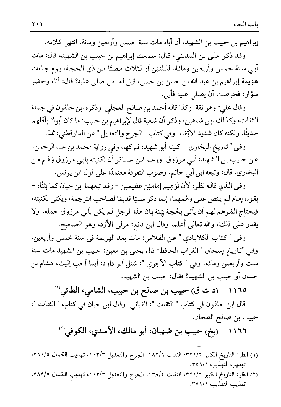 وفي "تاريخ البخاري": كنيته أبو شهيد، فتركها، وفي رواية محمد بن عبد الرحمن، عن حبيب بن الشهيد: أبي مرزوق. وزعم ابن عساكر أن تكنيته بأبي مرزوق وَهْم من البخاري، قال: وتبعه ابن أبي حاتم، وصوب التفرقة معتمدًا على قول ابن يونس.