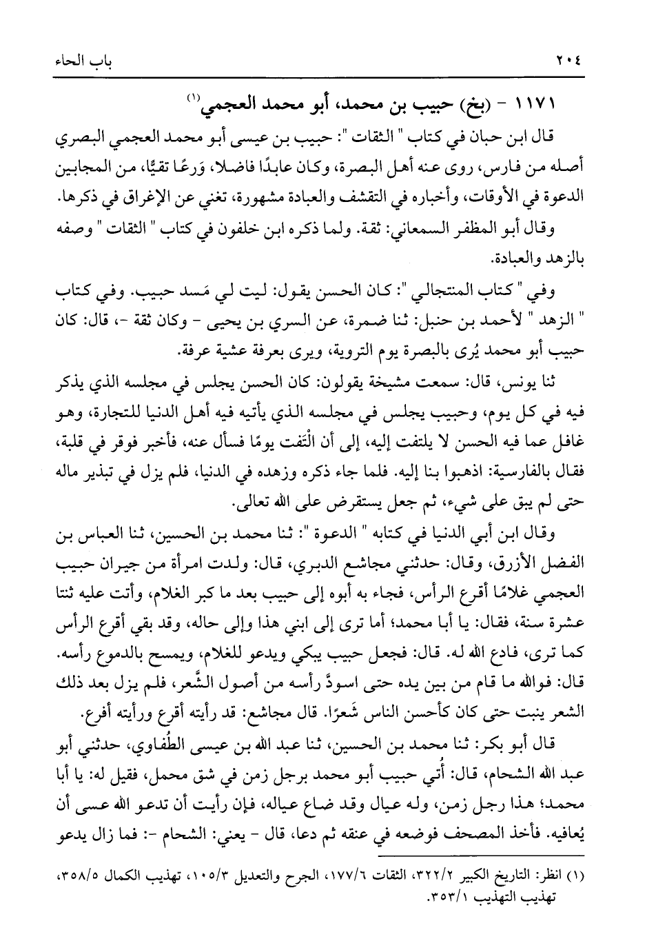 وفي "كتاب المنتجالي": كان الحسن يقول: ليت لي مَسد حبيب. وفي كتاب "الزهد" لأحمد بن حنبل: ثنا ضمرة، عن السري بن يحيى -وكان ثقة-، قال: كان حبيب أبو محمد يُرى بالبصرة يوم التروية، ويرى بعرفة عشية عرفة.