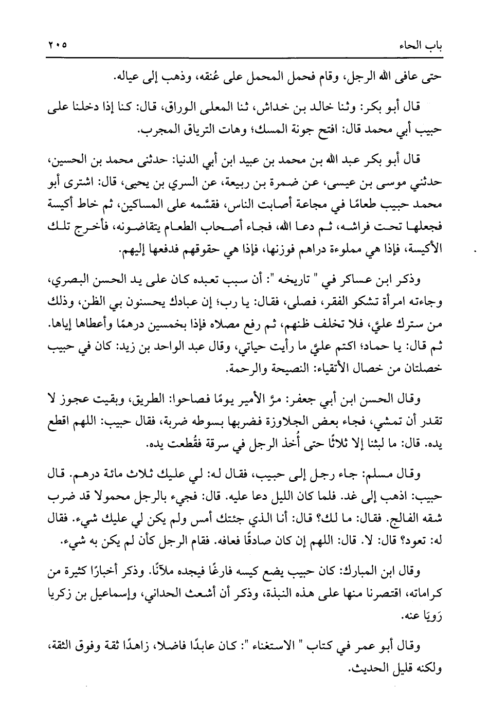 قال أبو بكر: وثنا خالد بن خداش، ثنا المعلى الوراق، قال: كنا إذا دخلنا على حبيب أبي محمد قال: افتح جونة المسك؛ وهات الترياق المجرب.