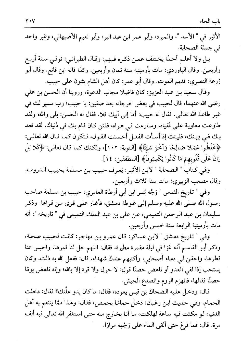 بل ولا أعلم أحدًا يختلف عمن ذكره فيهم، وقال الطبراني: توفي سنة أربع وأربعين. وقال الباوردي: مات بأرمينية سنة ثمان وأربعين. وكذا قاله ابن قانع. وقال أبو زرعة النصري: قديم الموت. وقال أبو عمر: كان أهل الشام يثنون على حبيب.