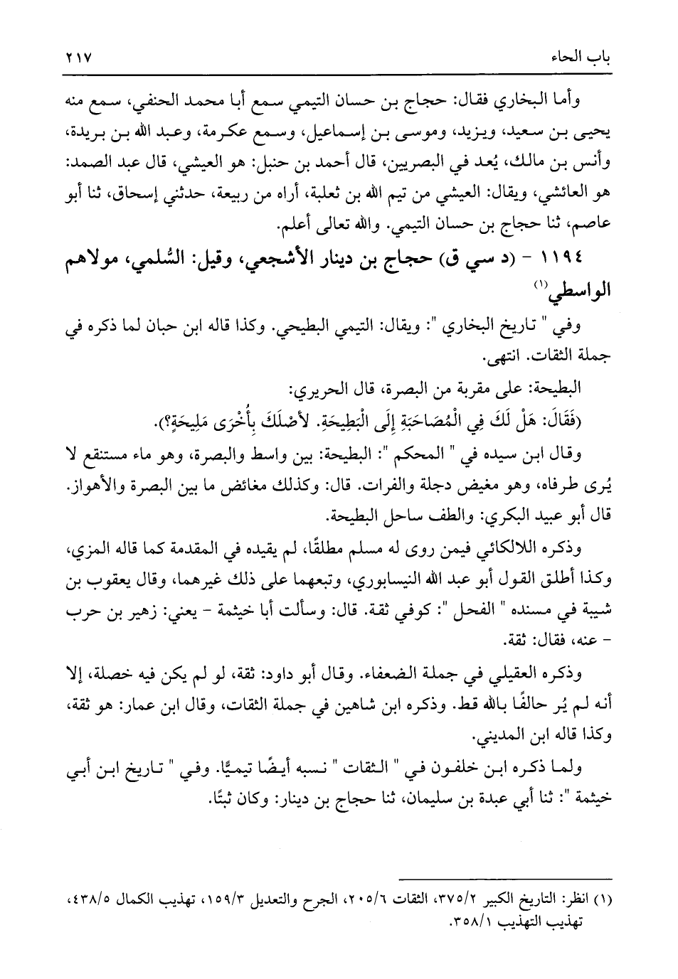 وأما البخاري فقال: حجاج بن حسان التيمي سمع أبا محمد الحنفي، سمع منه يحيى بن سعيد، ويزيد، وموسى بن إسماعيل، وسمع عكرمة، وعبد اللَّه بن بريدة، وأنس بن مالك، يُعد في البصريين، قال أحمد بن حنبل: هو العيشي، قال عبد الصمد: هو العائشي، ويقال: العيشي من تيم اللَّه بن ثعلبة، أراه من ربيعة، حدثني إسحاق، ثنا أبو عاصم، ثنا حجاج بن حسان التيمي. واللَّه تعالى أعلم.