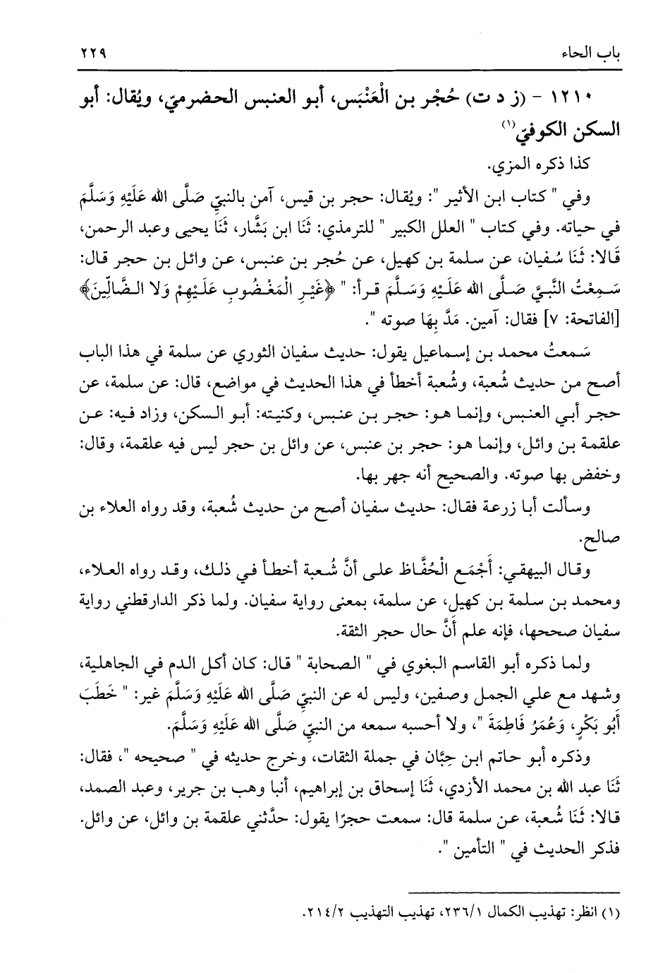 ١٢١٠ - (ز د ت) حُجْر بن الْعَنْبَس، أبو العنبس الحضرميّ، ويُقال: أبو السكن الكوفيّ (¬١)