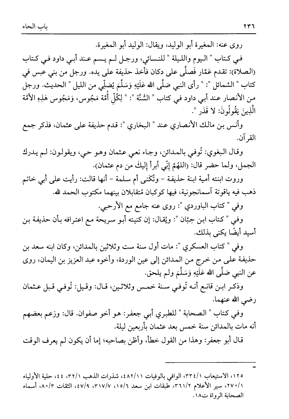 وقال البغوي: تُوفي بالمدائن، وجاء نعي عثمان وهو حي، ويقولون: لم يدرك الجمل، ولما حضر قال: (اللهُمَّ إِنِّي أبرأ إِليكَ من دم عثمان).