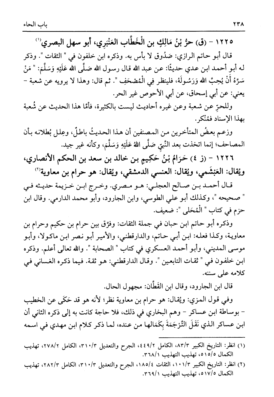 وفي قول المزي: ويُقال: هو حرام بن معاوية نظر؛ لأنه هو قد حَكَى عن الخطيب -بوساطة ابن عساكر- وهم البخاري في ذلك، فلا حاجة كانت به إلى ذكره الثاني أن ابن عساكر الذي نَقَلَ التَّرْجَمَةَ بِكَمَالها من عنده، لما ذكر كلام ابن مهدي في اسمه