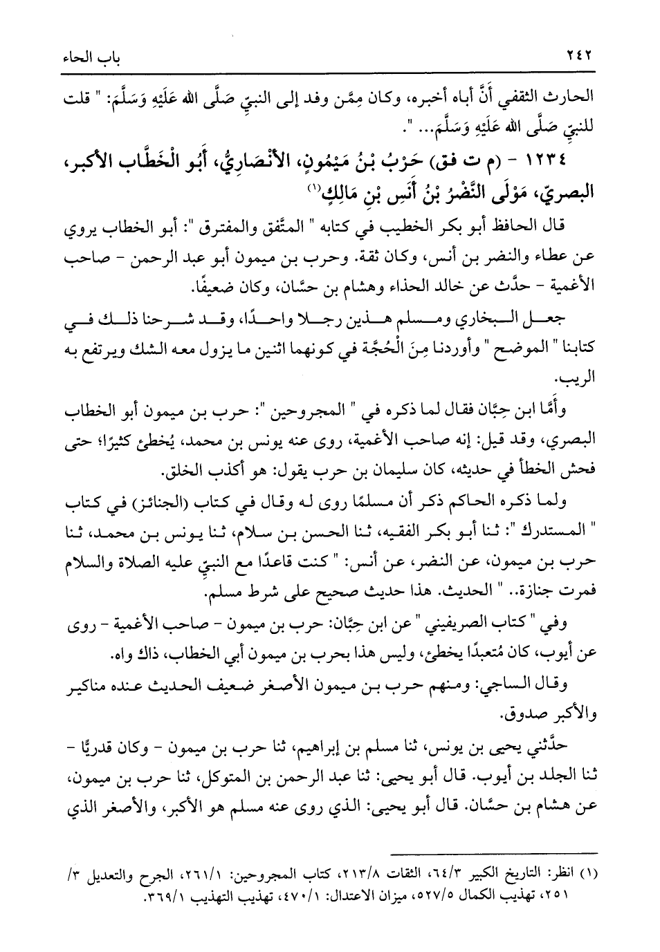 ١٢٣٤ - (م ت فق) حَرْبُ بْنُ مَيْمُونٍ، الأنْصَارِيُّ، أَبُو الْخَطَّاب الأكبر، البصريّ، مَوْلَى النَّضْرُ بْنُ أَنَسِ بْنِ مَالِكٍ (¬١)