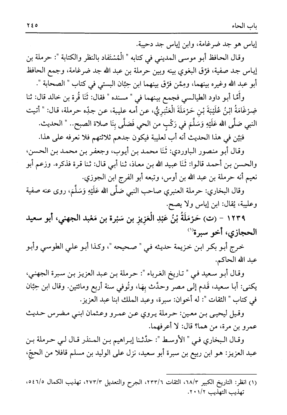 وقال أبو سعيد في "تاريخ الغرباء" حرملة بن عبد العزيز بن سبرة الجهني، يكنى: أبا سعيد، قَدم إلى مصر وحدَّث بِهَا، وتُوفي سنة أربع ومائتين. وقال ابن حِبَّان في كتاب "الثقات": له أخوان: سبرة، وعبد الملك ابنا عبد العزيز.