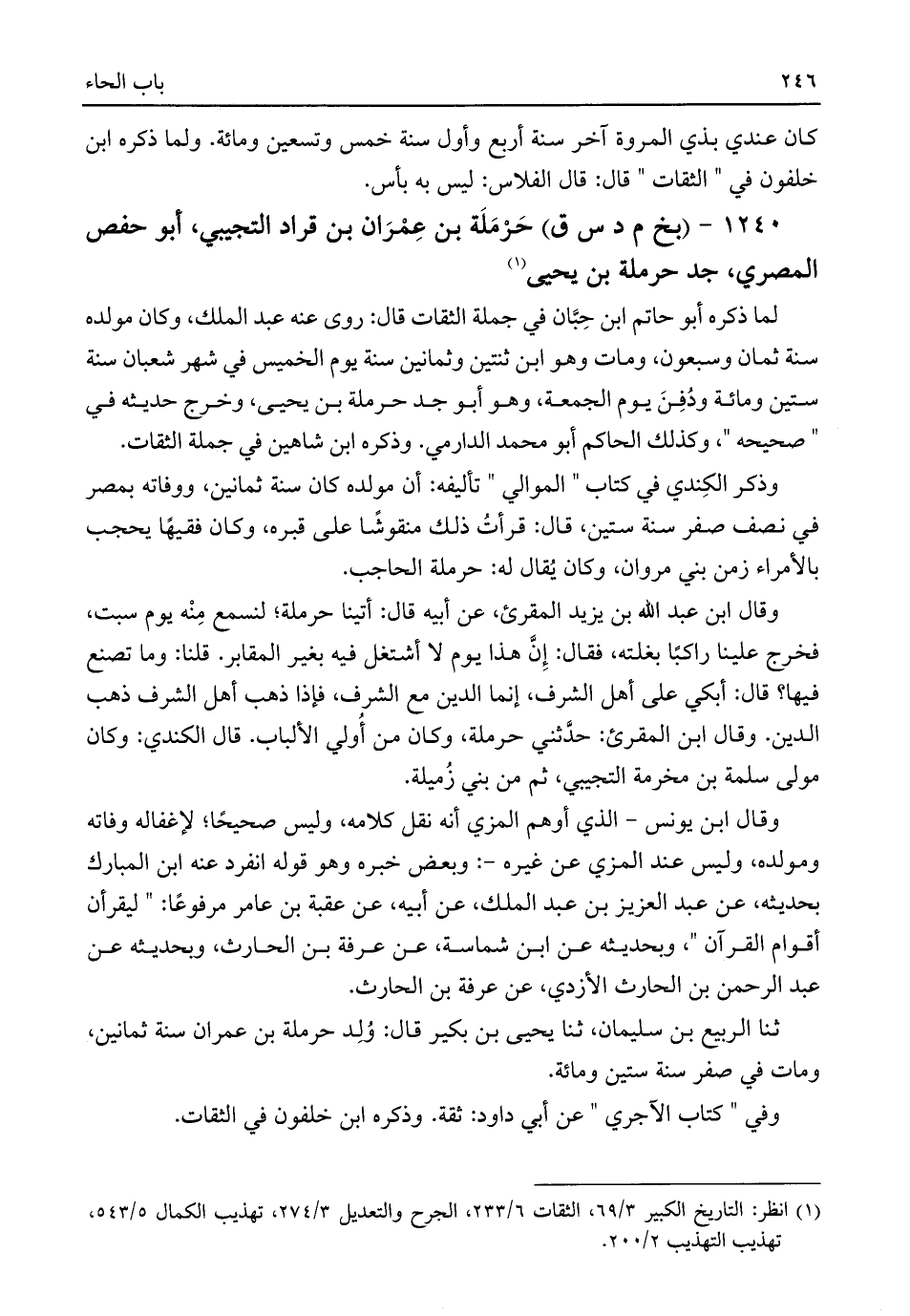 ١٢٤٠ - (بخ م د س ق) حَرْمَلَة بن عِمْرَان بن قراد التجيبي، أبو حفص المصري، جد حرملة بن يحيى (¬١)