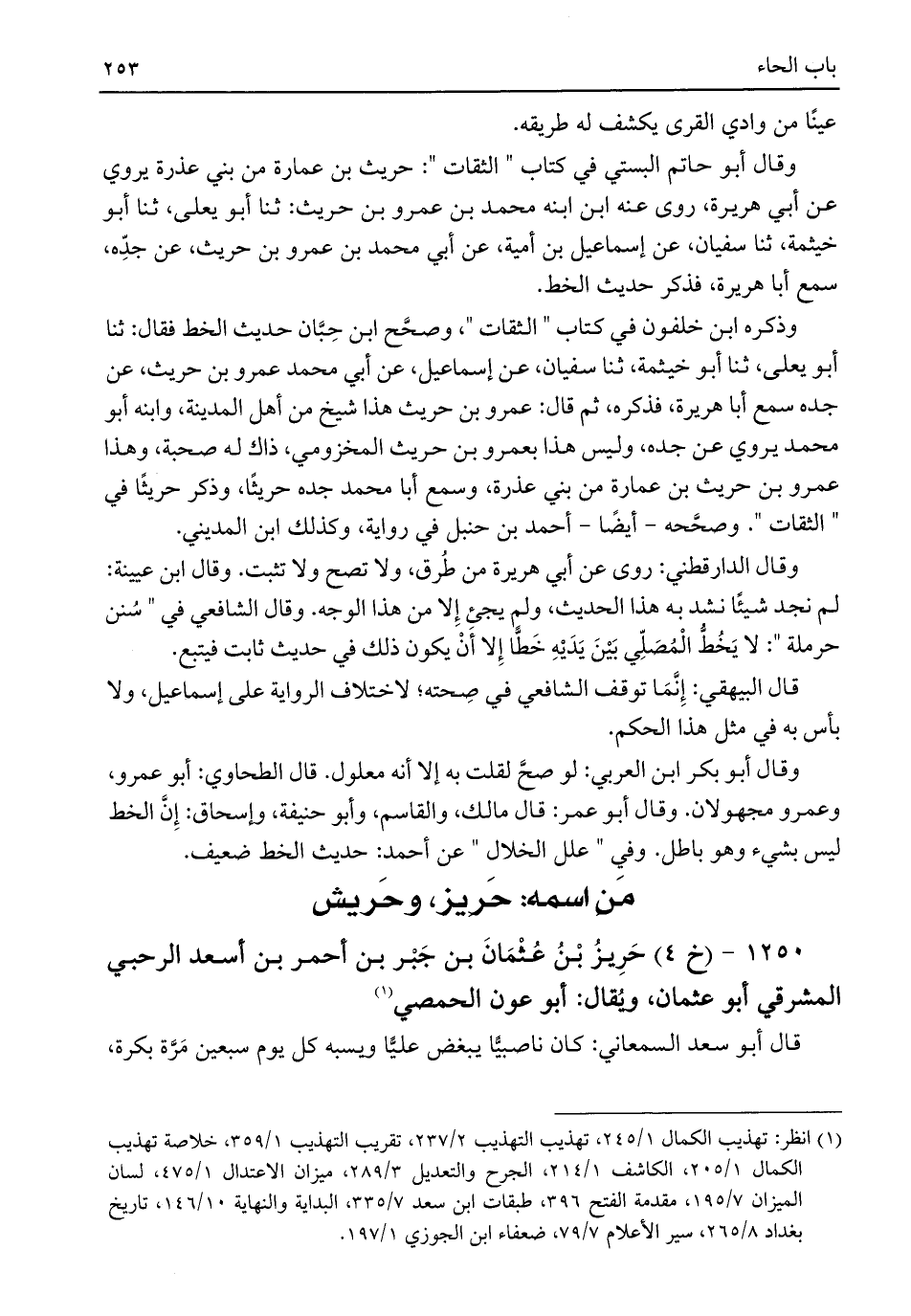 وقال أبو حاتم البستي في كتاب "الثقات": حريث بن عمارة من بني عذرة يروي عن أبي هريرة، روى عنه ابن ابنه محمد بن عمرو بن حريث: ثنا أبو يعلى، ثنا أبو خيثمة، ثنا سفيان، عن إسماعيل بن أمية، عن أبي محمد بن عمرو بن حريث، عن جدِّه، سمع أبا هريرة، فذكر حديث الخط.