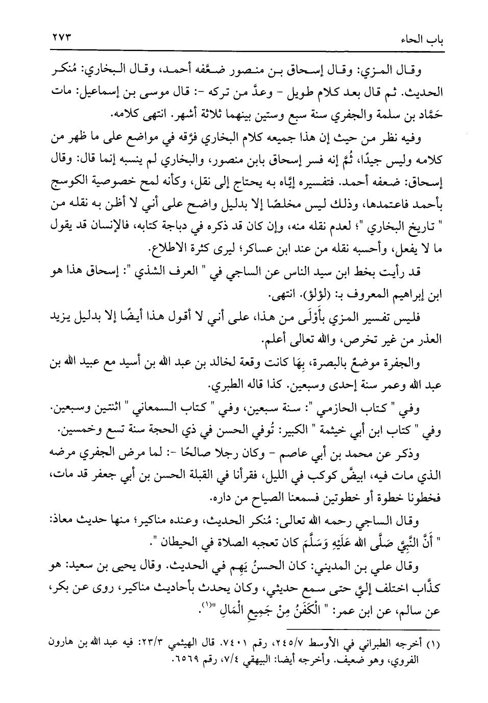 وفيه نظر من حيث إن هذا جميعه كلام البخاري فرَّقه في مواضع على ما ظهر من كلامه وليس جيدًا، ثمَّ إنه فسر إسحاق بابن منصور، والبخاري لم ينسبه إنما قال: وقال إسحاق: ضعفه أحمد. فتفسيره إيَّاه به يحتاج إلى نقل، وكأنه لمح خصوصية الكوسج بأحمد فاعتمدها، وذلك ليس مخلصًا إلا بدليل واضح على أني لا أظن به نقله من "تاريخ البخاري"؛ لعدم نقله منه، وإن كان قد ذكره في دباجة كتابه، فالإنسان قد يقول ما لا يفعل، وأحسبه نقله من عند ابن عساكر؛ ليرى كثرة الاطلاع.