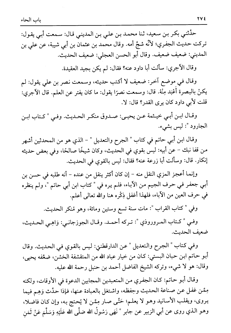 وقال أبو حاتم: كان الجفري من المتعبدين المجابين الدعوة في الأوقات، ولكنه مِمَّن غفل عن صناعة الحديث وحِفظه، واشتغل بالعبادة عنها، فإذا حدَّث وَهِم فيما يروى، ويقلب الأسانيد وهو لا يعلم؛ حَتَّى صار مِمَّن لا يُحتج به، وإن كان فاضلا، وهو الذي روى عن أبي الزبير عن جابر "نَهَى رَسُولُ اللَّه صَلَّى اللَّه عَلَيْهِ وَسَلَّمَ عَنْ ثَمَنِ