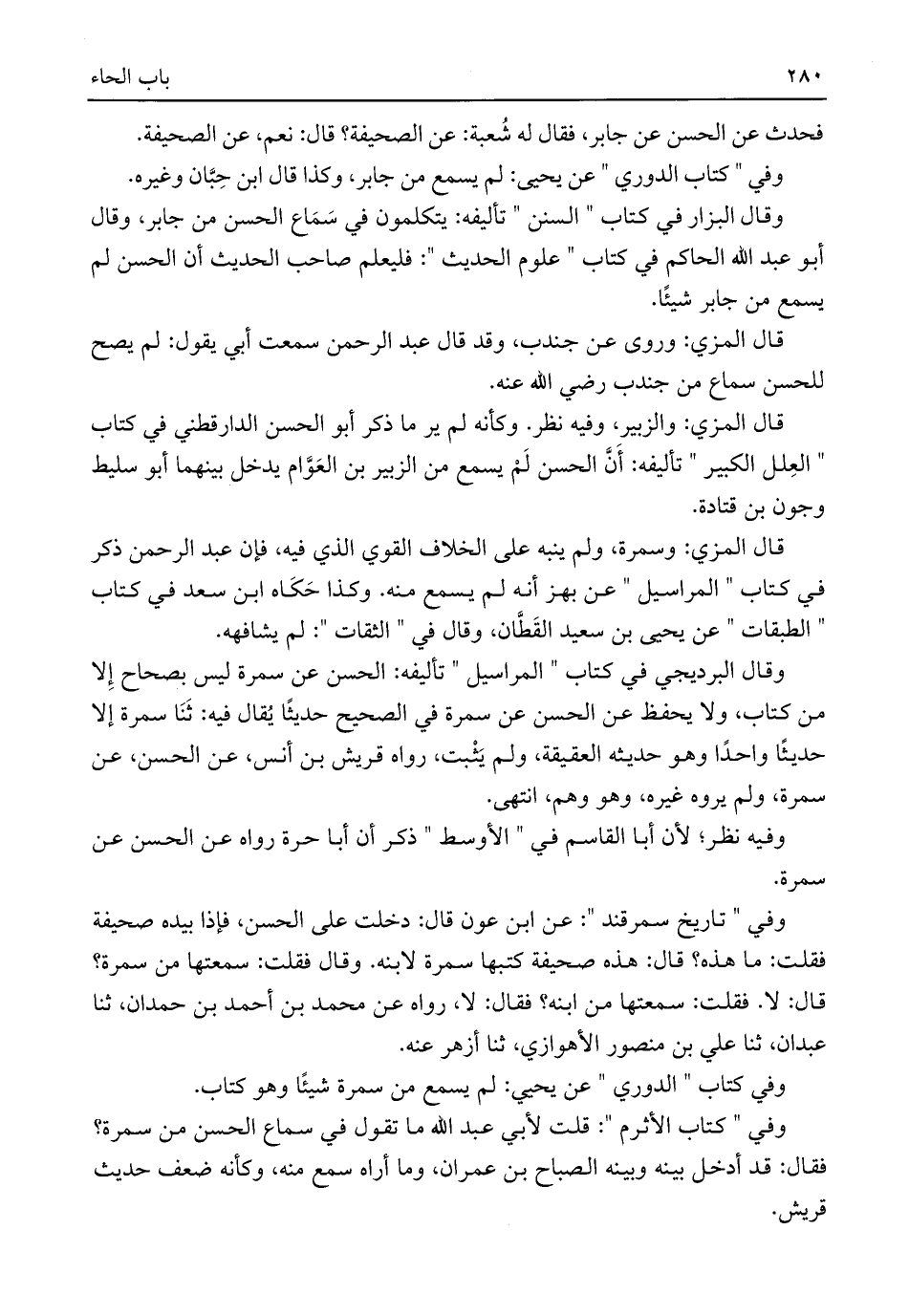 وقال البزار في كتاب "السنن" تأليفه: يتكلمون في سَمَاع الحسن من جابر، وقال أبو عبد اللَّه الحاكم في كتاب "علوم الحديث": فليعلم صاحب الحديث أن الحسن لم يسمع من جابر شيئًا.