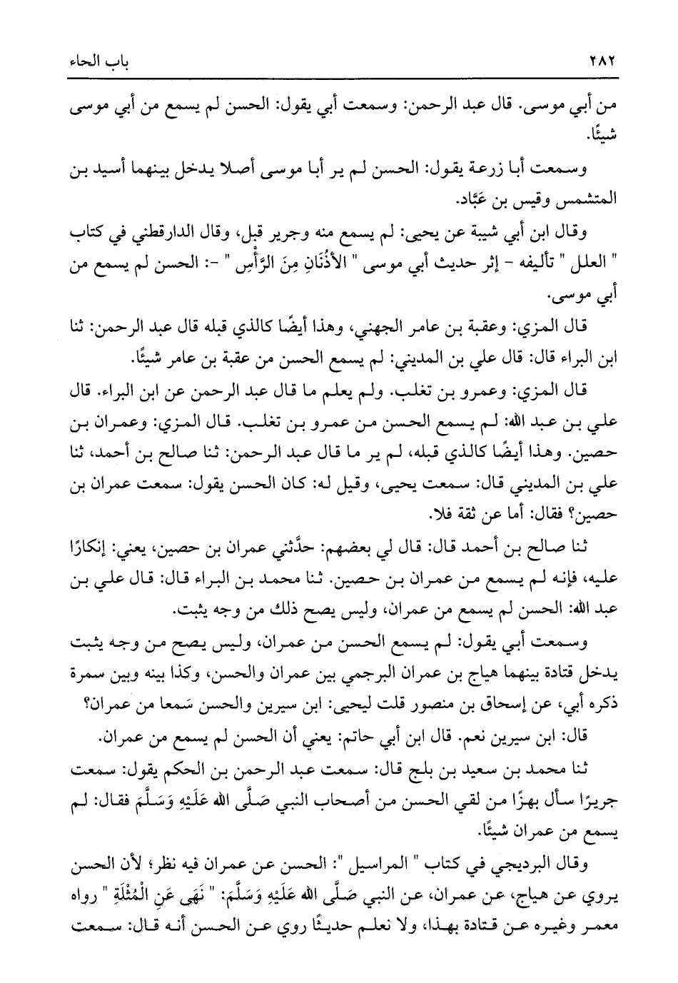 ثنا صالح بن أحمد قال: قال لي بعضهم: حدَّثني عمران بن حصين، يعني: إنكارًا عليه، فإنه لم يسمع من عمران بن حصين. ثنا محمد بن البراء قال: قال علي بن عبد اللَّه: الحسن لم يسمع من عمران، وليس يصح ذلك من وجه يثبت.