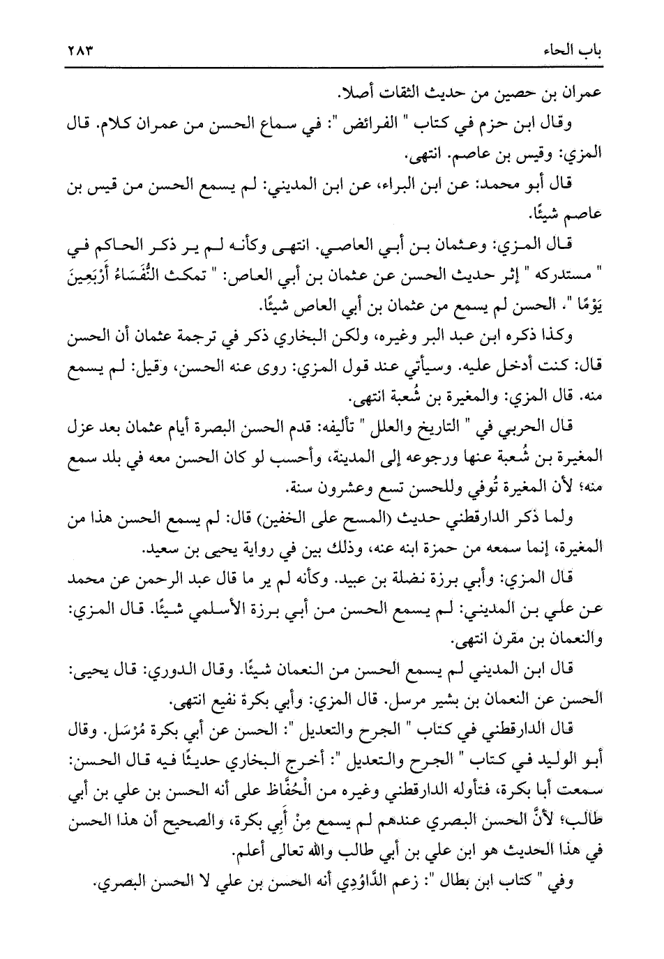 وقال ابن حزم في كتاب "الفرائض": في سماع الحسن من عمران كلام. قال المزي: وقيس بن عاصم. انتهى.