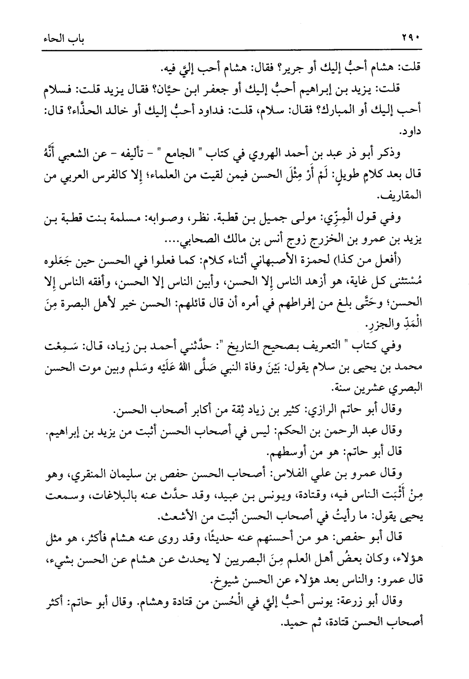 قال أبو حفص: هو من أحسنهم عنه حديثًا، وقد روى عنه هشام فأكثر، هو مثل هؤلاء، وكان بعضُ أهل العلم مِنَ البصريين لا يحدث عن هشام عن الحسن بشيء، قال عمرو: والناس بعد هؤلاء عن الحسن شيوخ.